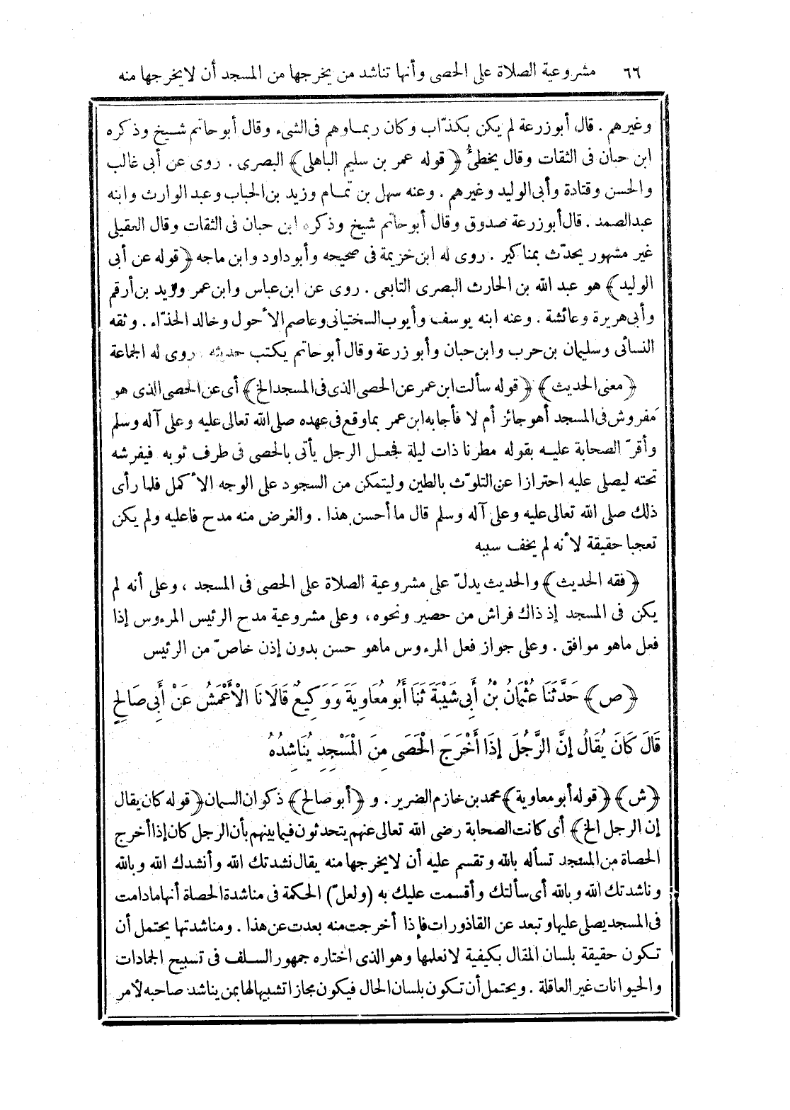 (ص) حَدَّثَنَا عُثْمَانُ بْنُ أَبِي شَيْبَةَ، ثَنَا أَبُو مُعَاوِيَةَ، وَوَكِيعٌ، قَالَا: نَا الْأَعْمَشُ، عَنْ أَبِي صَالِحٍ، قَالَ: " كَانَ يُقَالُ: إِنَّ الرَّجُلَ إِذَا أَخْرَجَ الْحَصَى مِنَ الْمَسْجِدِ يُنَاشِدُهُ "