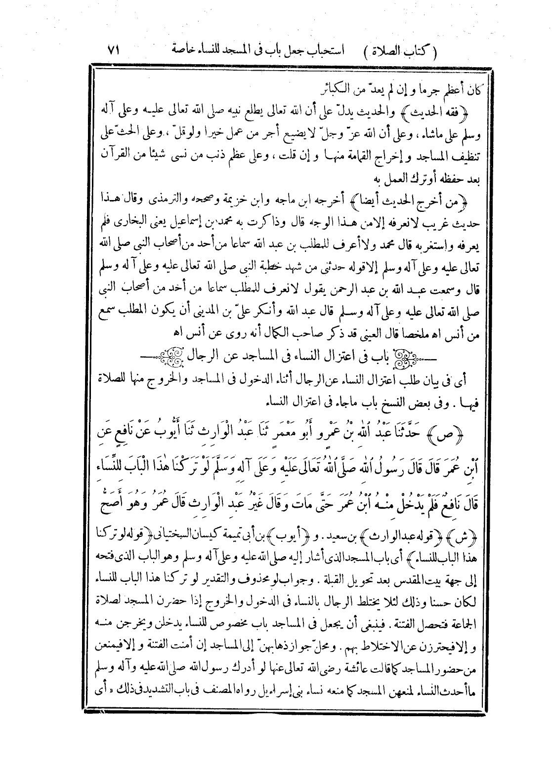 (قوله لو تركنا هذا الباب للنساء) أى باب المسجد الذى أشار إليه صلى الله عليه وعلى آله وسلم وهو الباب الذي فتحه إلى جهة بيت المقدس بعد تحويل القبلة. وجواب لو محذوف والتقدير لو تركنا هذا الباب للنساء لكان حسنا وذلك لئلا يختلط الرجال بالنساء في الدخول والخروج إذا حضرن المسجد لصلاة الجماعة فتحصل الفتنة. فينبغى أن يجعل في المساجد باب مخصوص للنساء يدخلن ويخرجن منه وإلا فيحترزن عن الاختلاط بهم. ومحلّ جواز ذهابهنّ إلى المساجد إن أمنت الفتنة وإلا فيمنعن من حضور المساجد كما قالت عائشة رَضِيَ اللَّهُ تَعَالَى عَنْهُا لو أدرك رسول الله صلى الله عليه وآله وسلم ما أحدث النساء لمنعهن المسجد كما منعه نساء بنى إسرائيل رواه المصنف في باب التشديد في ذلك "أى