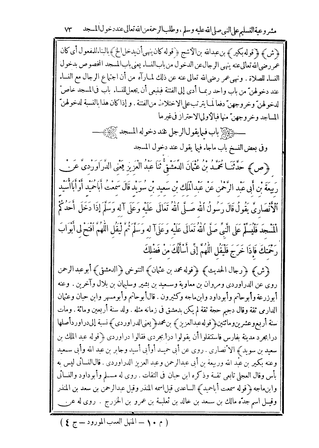 (ص) حَدَّثَنَا مُحَمَّدُ بْنُ عُثْمَانَ الدِّمَشْقِيُّ، ثَنَا عَبْدُ الْعَزِيزِ يَعْنِي الدَّرَاوَرْدِيَّ، عَنْ رَبِيعَةَ بْنِ أَبِي عَبْدِ الرَّحْمَنِ، عَنْ عَبْدِ الْمَلِكِ بْنِ سَعِيدِ بْنِ سُوَيْدٍ، قَالَ: سَمِعْتُ أَبَا حُمَيْدٍ، أَوْ أَبَا أُسَيْدٍ الْأَنْصَارِيَّ، يَقُولُ: قَالَ رَسُولُ اللَّهِ صَلَّى اللهُ تَعَالَى عَلَيْهِ وَعَلَى آلِهِ وسَلَّمَ: " إِذَا دَخَلَ أَحَدُكُمُ الْمَسْجِدَ فَلْيُسَلِّمْ عَلَى النَّبِيِّ صَلَّى اللهُ تَعَالَى عَلَيْهِ وَعَلَى آلِهِ وسَلَّمَ، ثُمَّ لِيَقُلْ: اللَّهُمَّ افْتَحْ لِي أَبْوَابَ رَحْمَتِكَ، فَإِذَا خَرَجَ فَلْيَقُلْ: اللَّهُمَّ إِنِّي أَسْأَلُكَ مِنْ فَضْلِكَ "