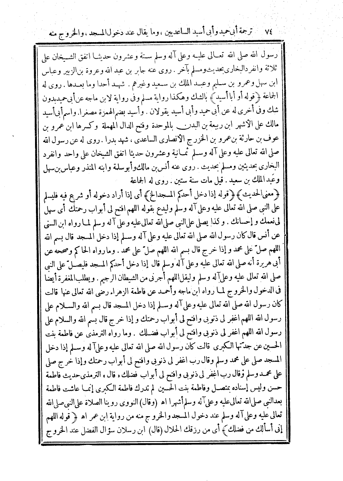 (قوله أو أبا أسيد) بالشك وهكذا رواية مسلم وفى رواية لابن ماجة عن أبى حميد بدون شك وفى أخرى له عن أبى حميد وأبي أسيد يقولان. وأسيد بضم الهمزة مصغرا. واسم أبى أسيد مالك على الأشهر ابن ربيعة بن البدن بالموحدة وفتح الدال المهملة وكسرها ابن عمرو بن عوف بن حارثة بن عمرو بن الخزرج الأنصارى الساعدى، شهد بدرا. روى له عن رسول الله صلى الله تعالى عليه وعلى آله وسلم ثمانية وعشرون حديثا اتفق الشيخان على واحد وانفرد البخارى بحديثين ومسلم بحديث. روى عنه أنس بن مالك وأبو سلمة وابنه المنذر وعباس بن سهل وعبد الملك بن سعيد. قيل مات سنة ستين. روى له الجماعة