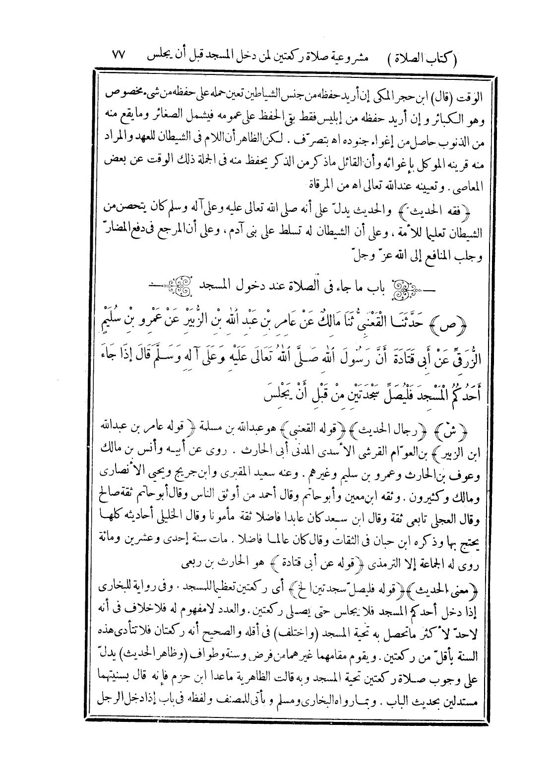 (ص) حَدَّثَنَا الْقَعْنَبِيُّ، ثَنَا مَالِكٌ، عَنْ عَامِرِ بْنِ عَبْدِ اللَّهِ بْنِ الزُّبَيْرِ، عَنْ عَمْرِو بْنِ سُلَيْمٍ الزُّرَقِيِّ، عَنْ أَبِي قَتَادَةَ، أَنَّ رَسُولَ اللَّهِ صَلَّى اللهُ تَعَالَى عَلَيْهِ وَعَلَى آلِهِ وسَلَّمَ قَالَ: «إِذَا جَاءَ أَحَدُكُمُ الْمَسْجِدَ فَلْيُصَلِّ سَجْدَتَيْنِ مِنْ قَبْلِ أَنْ يَجْلِسَ».