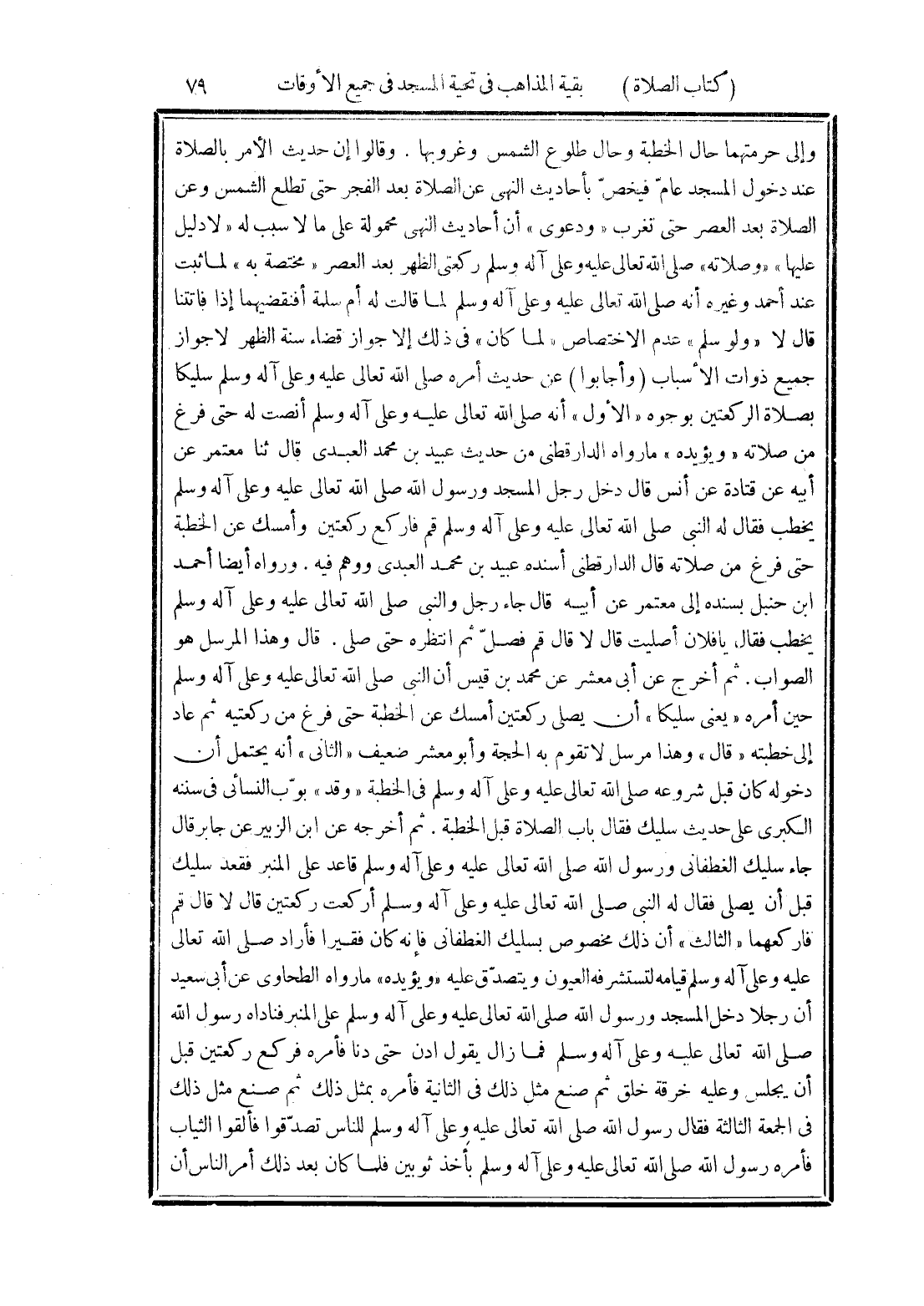 وإلى حرمتهما حال الخطبة وحال طلوع الشمس وغروبها. وقاوا إن حديث الأمر بالصلاة عند دخول المسجد عامّ فيخصّ بأحاديث النهى عن الصلاة بعد الفجر حتى تطلع الشمس وعن الصلاة بعد العصر حتى تغرب "ودعوى" أن أحاديث النهى محمولة على ما لا سبب له "لا دليل عليها" "وصلاته" صلى الله تعالى عليه وعلى آله وسلم ركعتى الظهر بعد العصر "مختصة به" لما ثبت عند أحمد وغيره أنه صلى الله تعالى عليه وعلى آله وسلم لما قالت له أم سلمة أفنقضيهما إذا فاتتنا قال لا "ولو سلم" عدم الاختصاص "لما كان" في ذلك إلا جواز قضاء سنة الظهر لا جواز جميع ذوات الأسباب (وأجابوا) عن حديث أمره صلى الله تعالى عليه وعلى آله وسلم سليكا بصلاة الركعتين بوجوه "الأول" أنه صلى الله تعالى عليه وعلى آله وسلم أنصت له حتى فرغ من صلاته "ويؤيده" ما رواه الدارقطنى من حديث عبيد بن محمد العبدى قال ثنا معتمر عن أبيه عن قتادة عن أنس قال دخل رجل المسجد ورسول الله صلى الله تعالى عليه وعلى آله وسلم يخطب فقال له النبي صلى الله تعالى عليه وعلى آله وسلم قم فاركع ركعتين وأمسك عن الخطبة حتى فرغ من صلاته قال الدارقطنى أسنده عبيد بن محمد العبدى ووهم فيه. ورواه أيضا أحمد ابن حنبل بسنده إلى معتمر عن أبيه قال جاء رجل والنبى صلى الله تعالى عليه وعلى آله وسلم يخطب فقال يا فلان أصليت قال لا قال قم فصلّ ثم انتظره حتى صلى. قال وهذا المرسل هو الصواب. ثم أخرج عن أبى معشر عن محمد بن قيس أن النبى صلى الله. تعالى عليه وعلى آله وسلم حين أمره "يعنى سليكا" أن يصلى ركعتين أمسك عن الخطبة حتى فرغ من ركعيه ثم عاد إلى خطبته "قال" وهذا مرسل لا تقوم به الحجة وأبو معشر ضعيف "الثاني" أنه يحتمل أن دخوله كان قبل شروعه صلى الله تعالى عليه وعلى آله وسلم في الخطبة "وقد" بوّب النسائي في سننه الكبرى على حديث سليك فقال باب الصلاة قبل الخطبة. ثم أخرجه عن ابن الزبير عن جابر قال جاء سليك الغطفاني ورسول الله صلى الله تعالى عليه وعلى آله وسلم قاعد على المنبر فقعد سليك قبل أن يصلي فقال له النبى صلى الله تعالى عليه وعلى آله وسلم أركعت ركعتين قال لا قال قم فاركعهما "الثالث" أن ذلك مخصوص بسليك الغطفاني فإنه كان فقيرا فأراد صلى الله تعالى عليه وعلى آله وسلم قيامه لتستشرفه العيون ويتصدّق عليه "ويؤيده" ما رواه الطحاوى عن أبى سعيد أن رجلا دخل المسجد ورسول الله صلى الله تعالى عليه وعلى آله وسلم على المنبر فناداه رسول الله صلى الله تعالى عليه وعلى آله وسلم فما زال يقول ادن حتى دنا فأمره فركع ركعتين قبل أن يجلس وعليه خرقة خلق ثم صنع مثل ذلك في الثانية فأمره بمثل ذلك ثم صنع مثل ذلك في الجمعة الثالثة فقال رسول الله صلى الله تعالى عليه وعلى آله وسلم للناس تصدّقوا فألقوا الثياب فأمره رسول الله صلى الله تعالى عليه وعلى آله وسلم بأخذ ثوبين فلما كان بعد ذلك أمر الناس أن