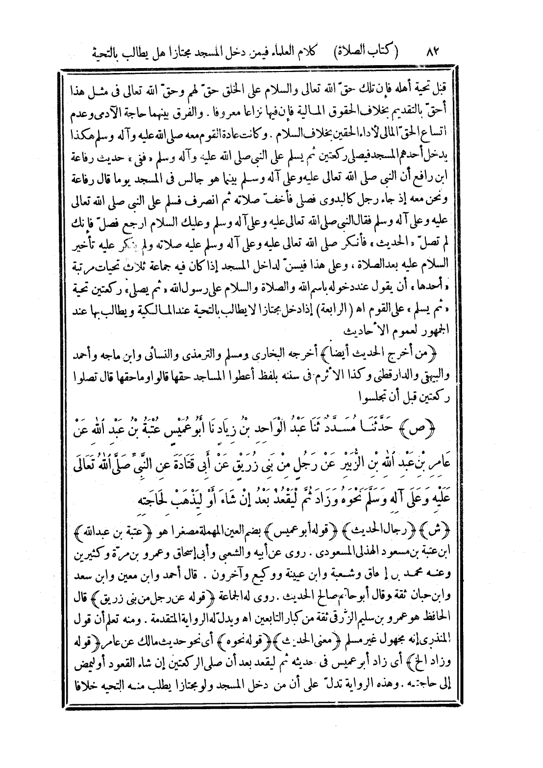 (قوله وزاد الخ) أى زاد أبو عميس في حديثه ثم ليقعد بعد أن صلى الركعتين إن شاء القعود أو ليمض إلى حاجته. وهذه الرواية تدل على أن من دخل المسجد ولو مجتازا يطلب منه التحية خلافا