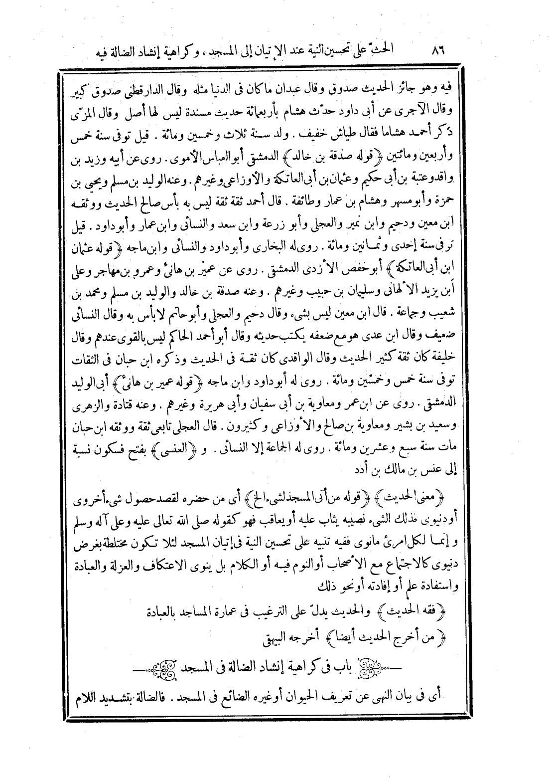 أى في بيان النهى عن تعريف الحيوان أو غيره الضائع في المسجد. فالضالة بتشديد اللام