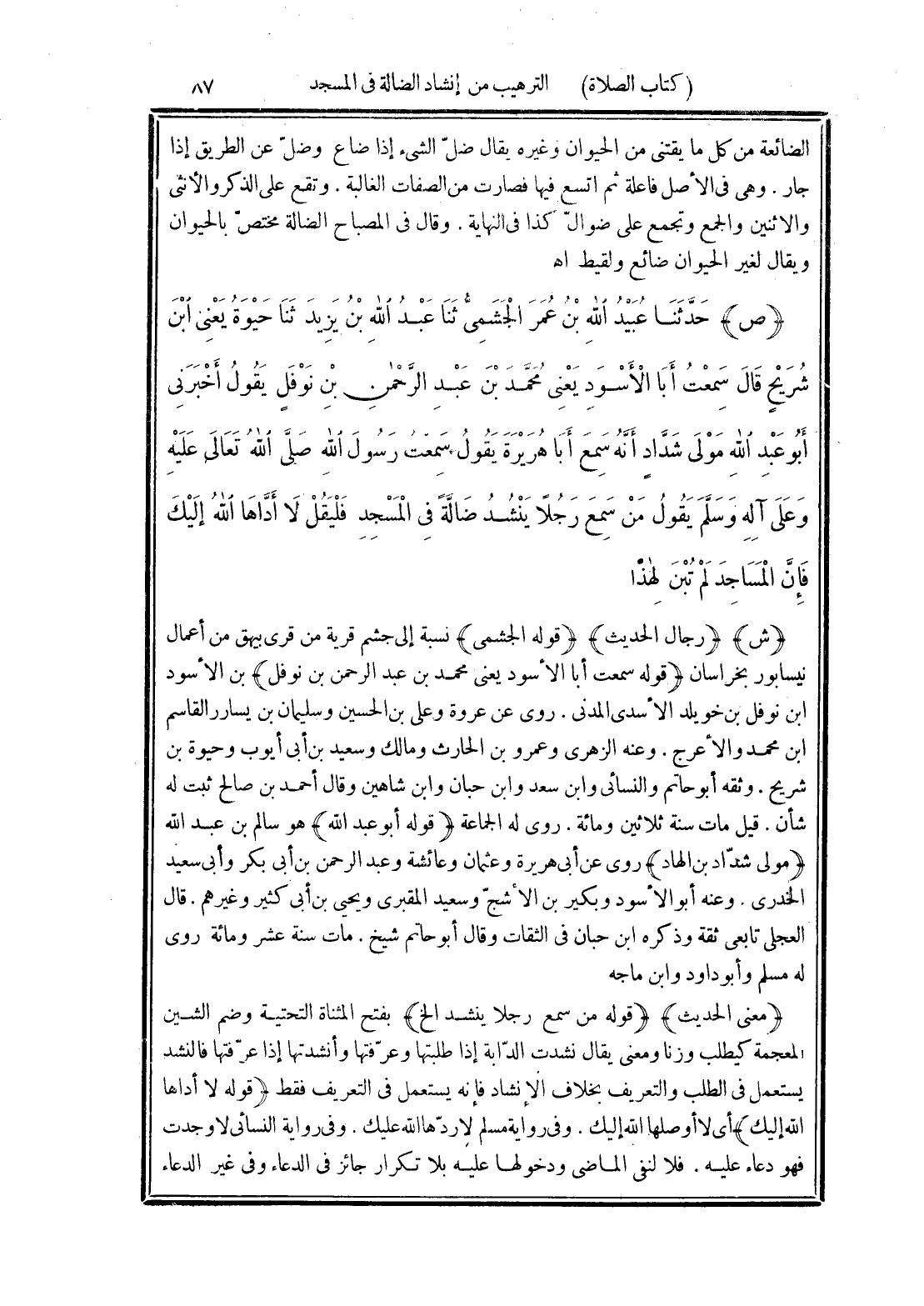 (ص) حَدَّثَنَا عُبَيْدُ اللَّهِ بْنُ عُمَرَ الْجُشَمِيُّ، ثَنَا عَبْدُ اللَّهِ بْنُ يَزِيدَ، ثَنَا حَيْوَةُ يَعْنِي ابْنَ شُرَيْحٍ، قَالَ: سَمِعْتُ أَبَا الْأَسْوَدِ يَعْنِي مُحَمَّدَ بْنَ عَبْدِ الرَّحْمَنِ بْنِ نَوْفَلٍ، يَقُولُ: أَخْبَرَنِي أَبُو عَبْدِ اللَّهِ، مَوْلَى شَدَّادٍ، أَنَّهُ سَمِعَ أَبَا هُرَيْرَةَ، يَقُولُ: سَمِعْتُ رَسُولَ اللَّهِ صَلَّى اللهُ تَعَالَى عَلَيْهِ وَسَلَّمَ يَقُولُ: " مَنْ سَمِعَ رَجُلًا يَنْشُدُ ضَالَّةً فِي الْمَسْجِدِ، فَلْيَقُلْ: لَا أَدَّاهَا اللَّهُ إِلَيْكَ فَإِنَّ الْمَسَاجِدَ لَمْ تُبْنَ لِهَذَا "