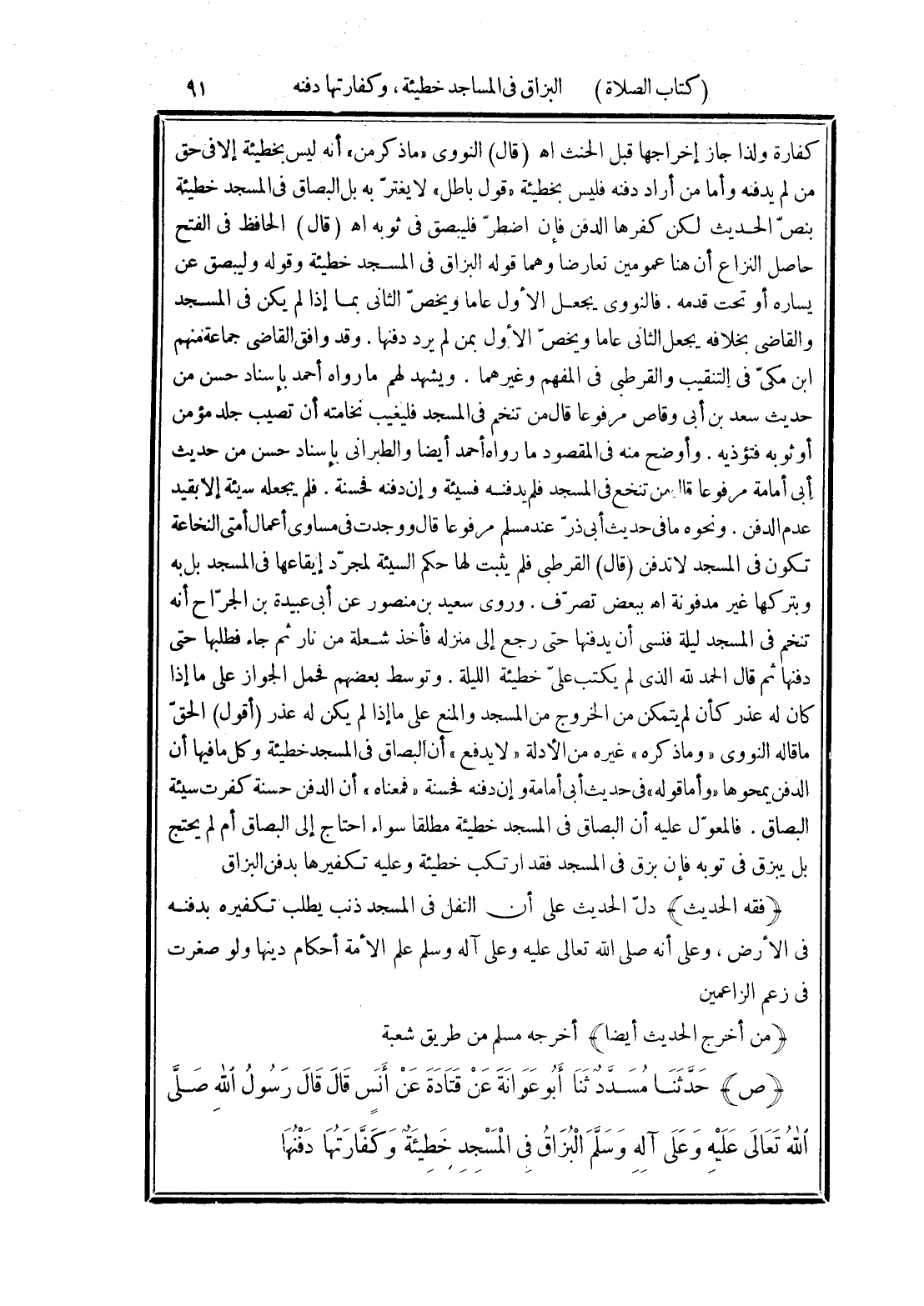 كفارة ولذا جاز إخراجها قبل الحنث اهـ (قال) النووى "ما ذكر من" أنه ليس بخطيئة إلا في حق من لم يدفنه وأما من أراد دفنه فليس بخطيئة "قول باطل" لا يغترّ به بل البصاق في المسجد خطيئة بنصّ الحديث لكن كفرها الدفن فإن اضطرّ فليبصق في ثوبه اهـ (قال) الحافظ في الفتح حاصل النزاع أن هنا عمومين تعارضا وهما قوله البزاق في المسجد خطيئة وقوله وليبصق عن يساره أو تحت قدمه. فالنووى يجعل الأول عاما ويخصّ الثانى بما إذا لم يكن في المسجد والقاضى بخلافه يجعل الثانى عاما ويخصّ الأول بمن لم يرد دفنها. وقد وافق القاضى جماعة منهم ابن مكيّ في التنقيب والقرطبي في المفهم وغيرهما. ويشهد لهم ما رواه أحمد بإسناد حسن من حديث سعد بن أبى وقاص مرفوعا قال من تنخم في المسجد فليغيب نخامته أن تصيب جلد مؤمن أو ثوبه فتؤذيه. وأوضح منه في المقصود ما رواه أحمد أيضا والطبرانى بإسناد حسن من حديث أبى أمامة مرفوعا قال من تنخع في المسجد فلم يدفنه فسيئة وإن دفنه فحسنة. فلم يجعله سيئة إلا بقيد عدم الدفن. ونحوه ما في حديث أبى ذرّ عند مسلم مرفوعا قال ووجدت في مساوى أعمال أمتي النخاعة تكون في المسجد لا تدفن (قال) القرطبى فلم يثبت لها حكم السيئة لمجرد إيقاعها في المسجد بل به وبتركها غير مدفونة اهـ ببعض تصرّف. وروى سعيد بن منصور عن أبى عبيدة في الجرّاح أنه تنخم في المسجد ليلة فنسى أن يدفنها حتى رجع إلى منزله فأخذ شعلة من نار ثم جاء فطلبها حتى دفنها ثم قال الحمد لله الذى لم يكتب عليّ خطيئة الليلة. وتوسط بعضهم فحمل الجواز على ما إذا كان له عذر كأن لم يتمكن من الخروح من المسجد والمنع على ما إذا لم يكن له عذر (أقول) الحق ما قاله النووى "وما ذكره" غيره من الأدلة "لا يدفع" أن البصاق في المسجد خطيئة وكل ما فيها أن الدفن يمحوها "وأما قوله" في حديث أبى أمامة وإن دفنه فحسنة "فمعناه" أن الدفن حسنة كفرت سيئة البصاق. فالمعوّل عليه أن البصاق في المسجد خطيئة مطلقا سواء احتاج إلى البصاق أم لم يحتج بل يبزق في ثوبه فإن بزق في المسجد فقد ارتكب خطيئة وعليه تكفيرها بدفن البزاق