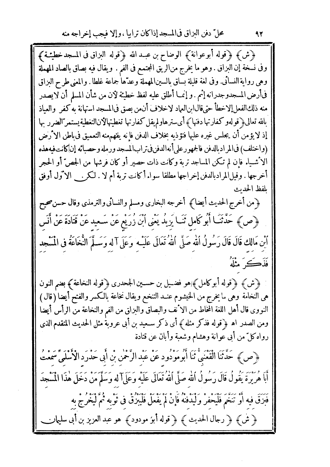 (قوله وكفارتها دفنها) أى سترها ولم يقل كفارتها تغطيتها لأن التغطية يستمر الضرر بها إذ لا يؤمن أن يجلس غيره عليها فتؤذيه بخلاف الدفن فإنه يفهم منه التعميق في باطن الأرض (واختلف) في المراد بالدفن فالجمهور على أنه الدفن في تراب المسجد ورمله وحصبائه إن كانت فيه هذه الأشياء فإن لم تكن المساجد تربة وكانت ذات حصير أو كان فرشها من الجصّ أو الحجر أخرجها. وقيل المراد بالدفن إخراجها مطلقا سواء أكانت تربة أم لا. لكن الأول أوفق بلفظ الحديث