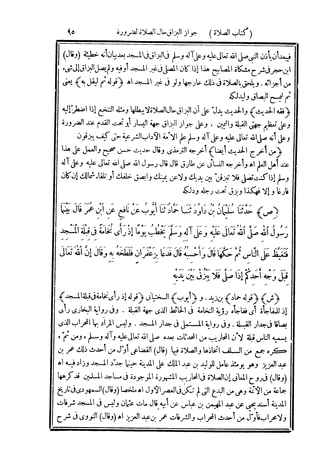 (فقه الحديث) والحديث يدل على أن البزاق حال الصلاة لا يبطلها ومثله التنخع إذا اضطر إليه وعلى تعظيم جهتى القبلة واليمين، وعلى جواز البزاق جهة اليسار أو تحت القدم عند الضرورة وعلى أنه صلى الله تعالى عليه وعلى آله وسلم علم الأمة الآداب الشرعية حتى كيف يبزقون