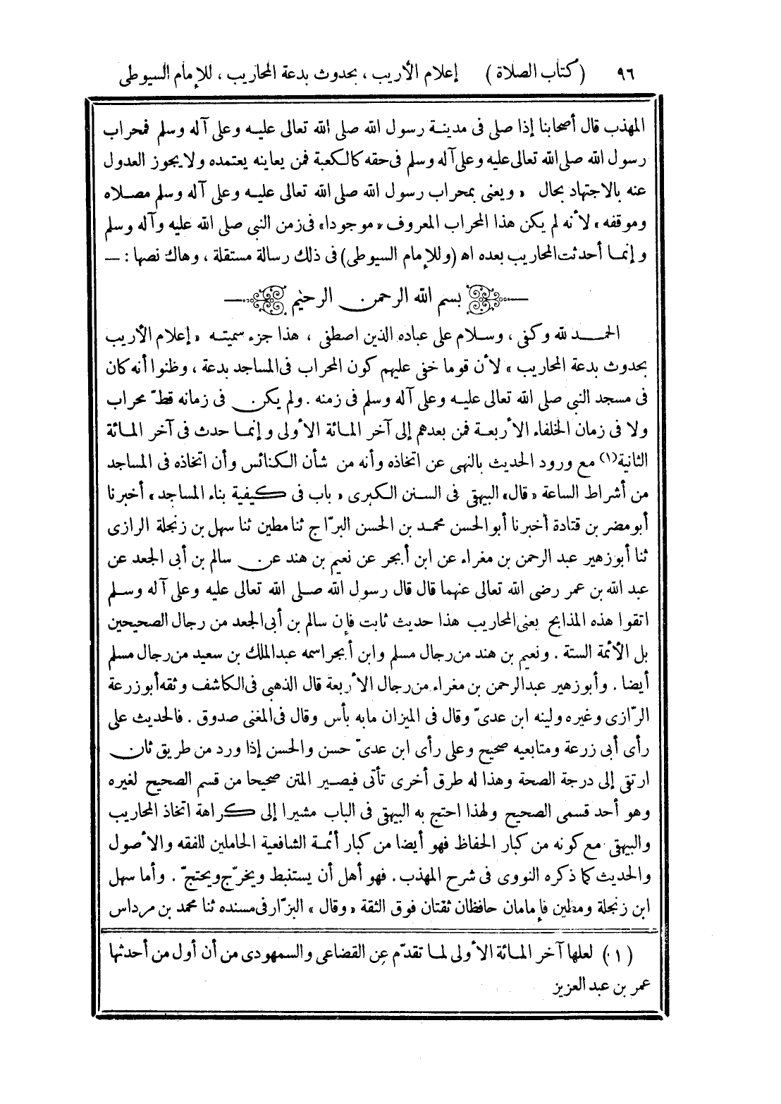 الحمد لله وكفى، وسلام على عباده الذين اصطفى، هذا جزء سميته "إعلام الأريب بحدوث بدعة المحاريب" لأن قوما خفى عليهم كون المحراب في المساجد بدعة، وظنوا أنه كان في مسجد النبي صلى الله تعالى عليه وعلى آله وسلم في زمنه. ولم يكن في زمانه قطّ محراب ولا في زمان الخلفاء الأربعة فمن بعدهم إلى آخر المائة الأولى وإنما حدث في آخر المائة الثانية (¬1) مع ورود الحديث بالنهى عن اتخاذه وأنه من شأن الكنائس وأن اتخاذه في المساجد من أشراط الساعة "قال" البيهقى في السنن الكبرى "باب في كيفية بناء المساجد" أخبرنا أبو مضر بن قتادة أخبرنا أبو الحسن محمد بن الحسن البرّاج ثنا مطين ثنا سهل بن زنجلة الرازى ثنا أبو زهير عبد الرحمن بن مغراء عن ابن أبجر عن نعيم بن هند عن سالم بن أبي الجعد عن عبد الله بن عمر رَضِيَ اللَّهُ تَعَالَى عَنْهُما قال قال رسول الله صلى الله تعالى عليه وعلى آله وسلم اتقوا هذه المذابح يعنى المحاريب هذا حديث ثابت فإن سالم بن أبى الجعد من رجال الصحيحين بل الأئمة الستة. ونعيم بن هند من رجال مسلم وابن أبجر اسمه عبد الملك بن سعيد من رجال مسلم أيضا. وأبو زهير عبد الرحمن بن مغراء من رجال الأربعة قال الذهبي في الكاشف وثقه أبو زرعة الرّازى وغيره ولينه ابن عدى وقال في الميزان ما به بأس وقال في المغنى صدوق. فالحديث على رأى أبى زرعة ومتابعيه صحيح وعلى رأى ابن عدى حسن والحسن إذا ورد من طريق ثان ارتقى إلى درجة الصحة وهذا له طرق أخرى تأتى فيصير المتن صحيحا من قسم الصحيح لغيره وهو أحد قسمى الصحيح ولهذا احتج به البيهقى في الباب مشيرا إلى كراهة اتخاذ المحاريب والبيهقى مع كونه من كبار الحفاظ فهو أيضا من كبار أئمة الشافعية الحاملين للفقه والأصول والحديث كما ذكره النووى في شرح المهذب. فهو أهل أن يستنبط ويخرّج ويحتجّ. وأما سهل ابن زنجلة ومطين فإمامان حافظان ثقتان فوق الثقة "وقال" البزّار في مسنده ثنا محمد بن مرداس