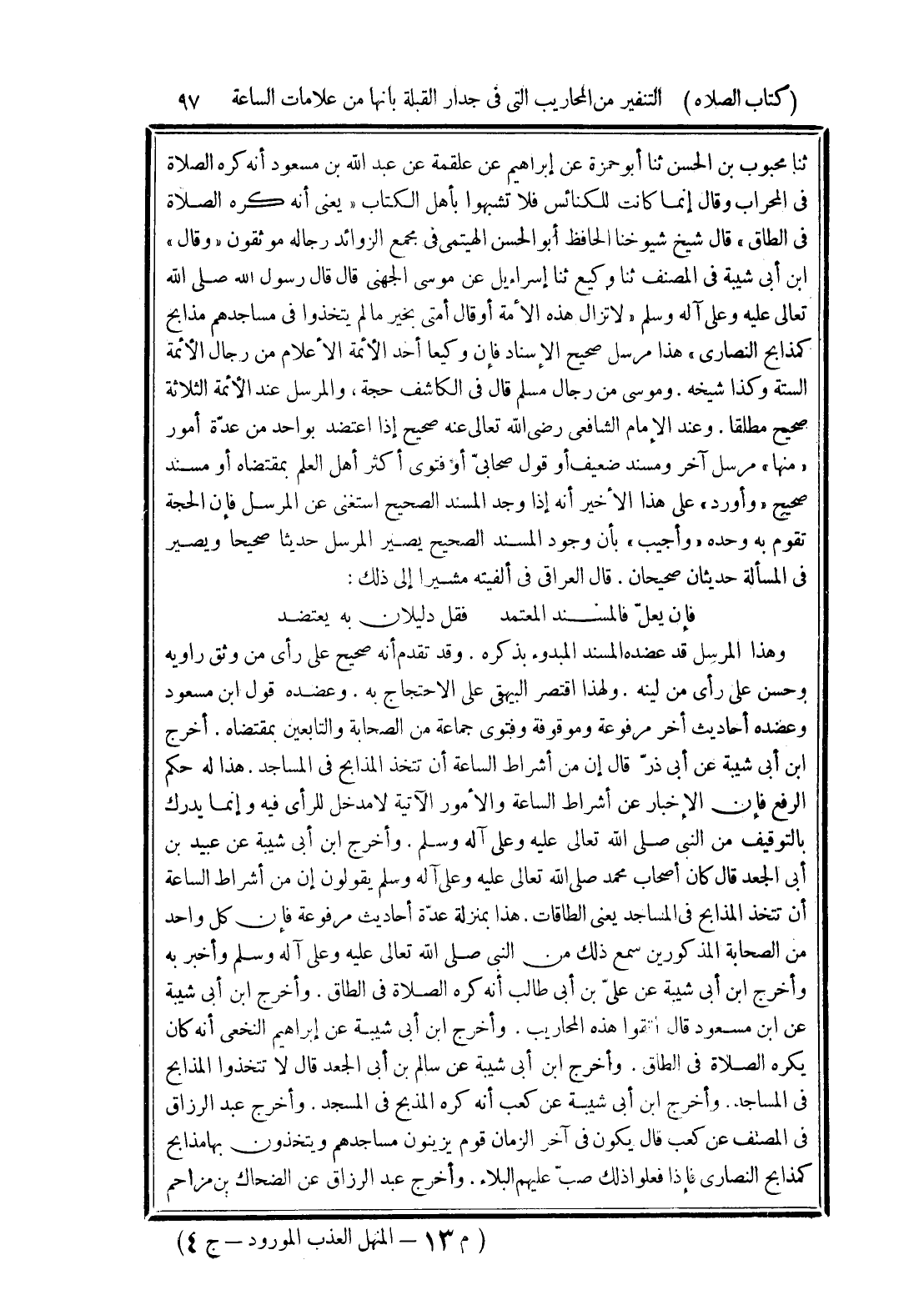 وهذا المرسل قد عضده المسند المبدوء بذكره. وقد تقدم أنه صحيح على رأى من وثق راويه وحسن على رأى من لينه. ولهذا اقتصر البيهقي على الاحتجاج به. وعضده قول ابن مسعود وعضده أحاديث أخر مرفوعة وموقوفة وفتوى جماعة من الصحابة والتابعين بمقتضاه. أخرج ابن أبى شيبة عن أبى ذرّ قال إن من أشراط الساعة أن تتخذ المذابح في المساجد. هذا له حكم الرفع فإن الإخبار عن أشراط الساعة والأمور الآتية لا مدخل للرأى فيه وإنما يدرك بالتوقيف من النبى صلى الله تعالى عليه وعلى آله وسلم. وأخرج ابن أبى شيبة عن عبيد بن أبى الجعد قال كان أصحاب محمد صلى الله تعالى عليه وعلى آله وسلم يقولون إن من أشراط الساعة أن تتخذ المذابح في المساجد يعنى الطاقات. هذا بمنزلة عدّة أحاديث مرفوعة فإن كل واحد من الصحابة المذكورين سمع ذلك من النبى صلى الله تعالى عليه وعلى آله وسلم وأخبر به وأخرج ابن أبى شيبة عن علىّ بن أبى طالب أنه كره الصلاة في الطاق. وأخرج ابن أبى شيبة عن ابن مسعود قال اتقوا هذه المحاريب. وأخرج ابن أبى شيبة عن إبراهيم النخعى أنه كان يكره الصلاة في الطاق. وأخرج ابن أبى شيبة عن سالم بن أبى الجعد قال لا تتخذوا المذابح في المساجد. وأخرج ابن أبى شيبة عن كعب أنه كره المذبح في المسجد. وأخرج عبد الرزاق في المصنف عن كعب قال يكون في آخر الزمان قوم يزينون مساجدهم ويتخذون بها مذابح كمذابح النصارى فإذا فعلوا ذلك صبّ عليهم البلاء. وأخرج عبد الرزاق عن الضحاك بن مزاحم