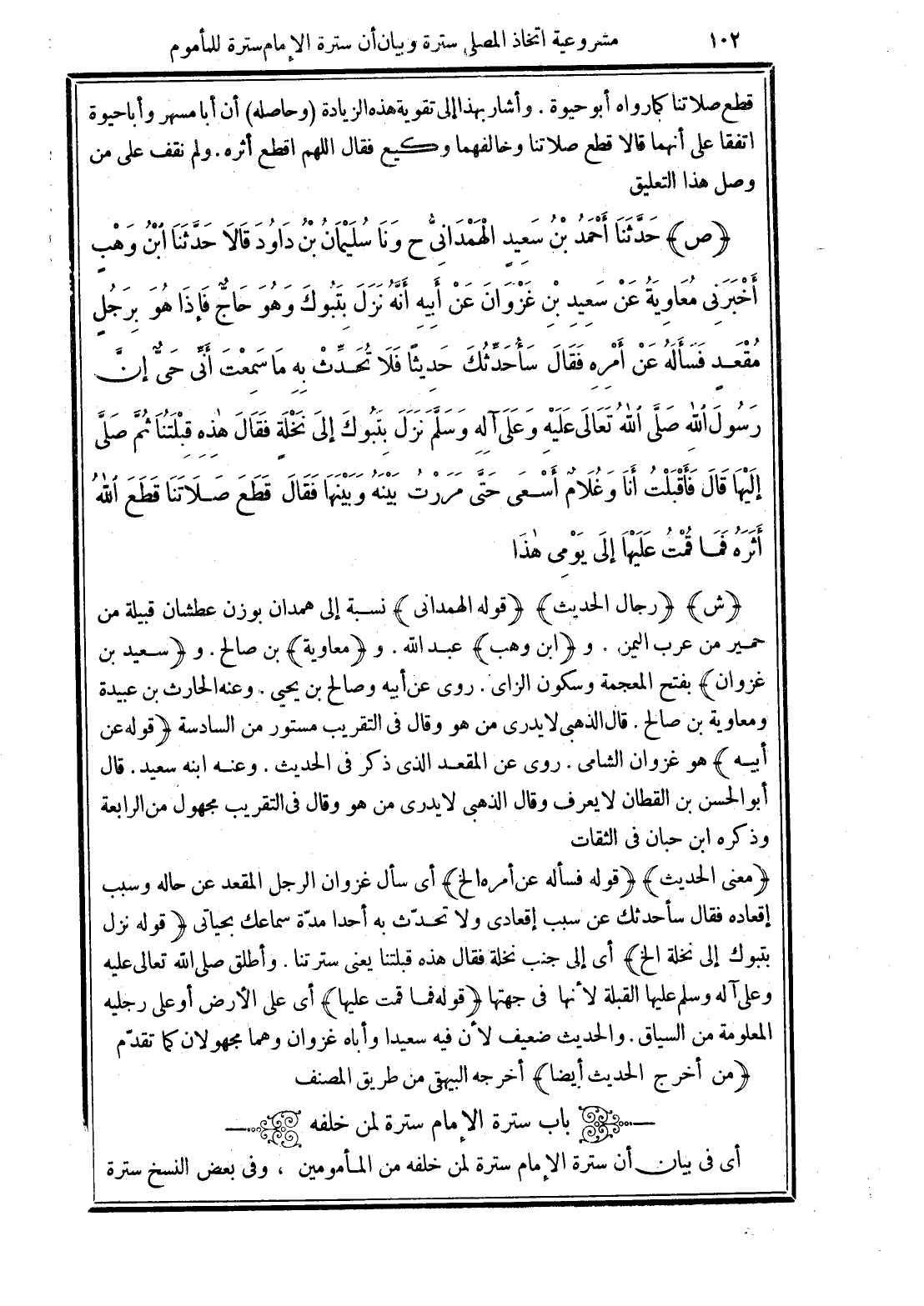 (ص) حَدَّثَنَا أَحْمَدُ بْنُ سَعِيدٍ الْهَمْدَانِيُّ، ح وَنَا سُلَيْمَانُ بْنُ دَاوُدَ، قَالَا: حَدَّثَنَا ابْنُ وَهْبٍ، أَخْبَرَنِي مُعَاوِيَةُ، عَنْ سَعِيدِ بْنِ غَزْوَانَ، عَنْ أَبِيهِ، أَنَّهُ نَزَلَ بِتَبُوكَ وَهُوَ حَاجٌّ فَإِذَا هُوَ بِرَجُلٍ مُقْعَدٍ فَسَأَلَهُ عَنْ أَمْرِهِ فَقَالَ: سَأُحَدِّثُكَ حَدِيثًا فَلَا تُحَدِّثْ بِهِ مَا سَمِعْتَ أَنِّي حَيٌّ، إِنَّ رَسُولَ اللَّهِ صَلَّى اللهُ تَعَالَى عَلَيْهِ وَعَلَى آلِهِ وسَلَّمَ نَزَلَ بِتَبُوكَ إِلَى نَخْلَةٍ فَقَالَ: «هَذِهِ قِبْلَتُنَا»، ثُمَّ صَلَّى إِلَيْهَا فَأَقْبَلْتُ وَأَنَا غُلَامٌ أَسْعَى حَتَّى مَرَرْتُ بَيْنَهُ وَبَيْنَهَا فَقَالَ: «قَطَعَ صَلَاتَنَا قَطَعَ اللَّهُ أَثَرَهُ» فَمَا قُمْتُ عَلَيْهَا إِلَى يَوْمِي هَذَا