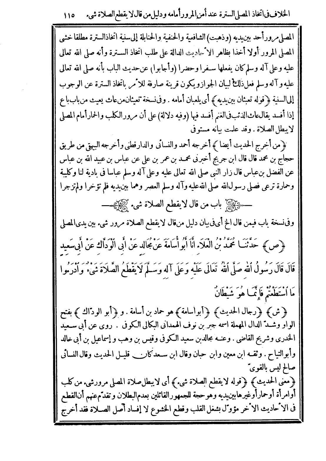 (ص) حَدَّثَنَا مُحَمَّدُ بْنُ الْعَلَاءِ، أنَا أَبُو أُسَامَةَ، عَنْ مُجَالِدٍ، عَنْ أَبِي الْوَدَّاكِ، عَنْ أَبِي سَعِيدٍ، قَالَ: قَالَ رَسُولُ اللَّهِ صَلَّى اللهُ تَعَالَى عَلَيْهِ وَعَلَى آلِهِ وسَلَّمَ: «لَا يَقْطَعُ الصَّلَاةَ شَيْءٌ وَادْرَءُوا مَا اسْتَطَعْتُمْ فَإِنَّمَا هُوَ شَيْطَانٌ»