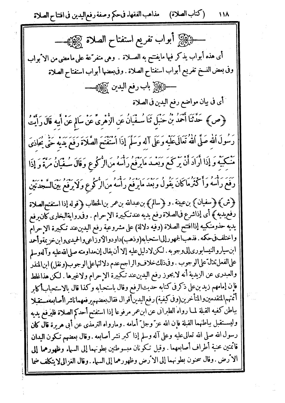(ص) حَدَّثَنَا أَحْمَدُ بْنُ مُحَمَّدِ بْنِ حَنْبَلٍ، ثَنَا سُفْيَانُ، عَنِ الزُّهْرِيِّ، عَنْ سَالِمٍ، عَنْ أَبِيهِ، قَالَ: رَأَيْتُ رَسُولَ اللَّهِ صَلَّى اللهُ تَعَالَى عَلَيْهِ وَعَلَى آلِهِ وسَلَّمَ "إِذَا اسْتَفْتَحَ الصَّلَاةَ رَفَعَ يَدَيْهِ حَتَّى يُحَاذِيَ مَنْكِبَيْهِ، وَإِذَا أَرَادَ أَنْ يَرْكَعَ وَبَعْدَمَا يَرْفَعُ رَأْسَهُ مِنَ الرُّكُوعِ -وَقَال سُفْيَانُ مَرَّةً: وَإِذَا رَفَعَ رَأْسَهُ وَأَكْثَرُ مَا كَانَ يَقُولُ: وَبَعْدَ مَا يَرْفَعُ رَأْسَهُ مِنَ الرُّكُوعِ- وَلَا يَرْفَعُ بَيْنَ السَّجْدَتَيْنِ"