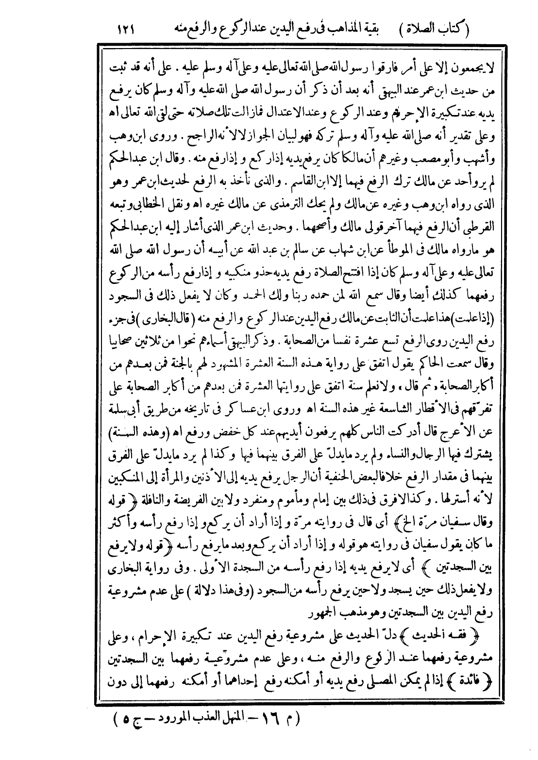 (فقه الحديث) دلّ الحديث على مشروعية رفع اليدين عند تكبيرة الإحرام، وعلى مشروعية رفعهما عند الركوع والرفع منه، وعلى عدم مشروعية رفعهما بين السجدتين (فائدة) إذا لم يمكن المصلى رفع يديه أو أمكنه رفع إحداهما أو أمكنه رفعهما إلى دون