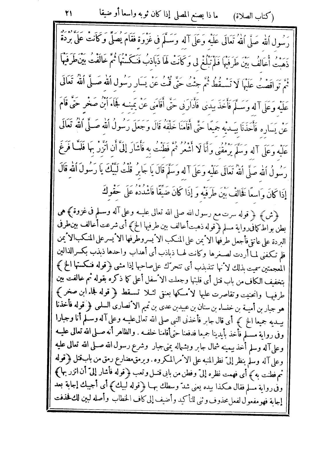 رَسُولِ اللهِ صَلَّى اللهُ تَعَالَى عَلَيْهِ وَعَلَى آلِهِ وسَلَّمَ فِي غَزْوَةٍ، فَقَامَ يُصَلِّي، وَكَانَتْ عَلَيَّ بُرْدَةٌ ذَهَبْتُ أُخَالِفُ بَيْنَ طَرَفَيْهَا فَلَمْ تَبْلُغْ لِي، وَكَانَتْ لَهَا ذَبَاذِبُ فَنَكَّسْتُهَا، ثُمَّ خَالَفْتُ بَيْنَ طَرَفَيْهَا، ثُمَّ تَوَاقَصْتُ عَلَيْهَا لَا تَسْقُطُ، ثُمَّ جِئْتُ حَتَّى قُمْتُ عَنْ يَسَارِ رَسُولِ اللَّهِ صَلَّى اللهُ تَعَالَى عَلَيْهِ وَعَلَى آلِهِ وَسَلَّمَ فَأَخَذَ بِيَدِي فَأَدَارَنِي، حَتَّى أَقَامَنِي عَنْ يَمِينِهِ فَجَاءَ ابْنُ صَخْرٍ، حَتَّى قَامَ عَنْ يَسَارِهِ فَأَخَذَنَا بِيَدَيْهِ جَمِيعًا، حَتَّى أَقَامَنَا خَلْفَهُ، قَالَ: وَجَعَلَ رَسُولُ اللَّهِ صَلَّى اللهُ تَعَالَى عَلَيْهِ وَعَلَى آلِهِ وَسَلَّمَ يَرْمُقُنِي وَأَنَا لَا أَشْعُرُ ثُمَّ فَطِنْتُ بِهِ فَأَشَارَ إِلَيَّ أَنْ اتَّزِرَ بِهَا فَلَمَّا فَرَغَ رَسُولُ اللَّهِ صَلَّى اللهُ تَعَالَى عَلَيْهِ وَعَلَى آلِهِ وسَلَّمَ، قَالَ: «يَا جَابِرُ»، قَالَ: قُلْتُ: لَبَّيْكَ يَا رَسُولَ اللَّهِ، قَالَ: «إِذَا كَانَ وَاسِعًا فَخَالِفْ بَيْنَ طَرَفَيْهِ، وَإِذَا كَانَ ضَيِّقًا فَاشْدُدْهُ عَلَى حِقْوِكَ»