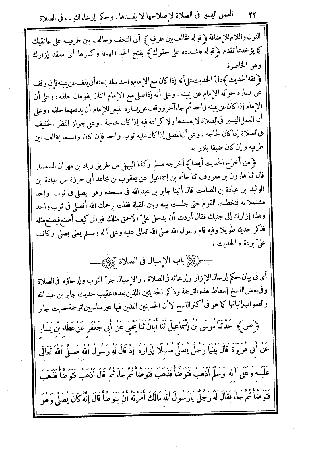 أى في بيان حكم إرسال الإزار وإرخائه في الصلاة. والإسبال جرّ الثوب وإرخاؤه في الصلاة وفي بعض النسخ إسقاط هذه الترجمة وذكر الحديثين اللذين بعدها عقيب حديث جابر بن عبد الله والصواب إثباتها كما هو في أكثر النسخ لأن الحديثين اللذين فيها غير مناسبين لترجمة حديث جابر