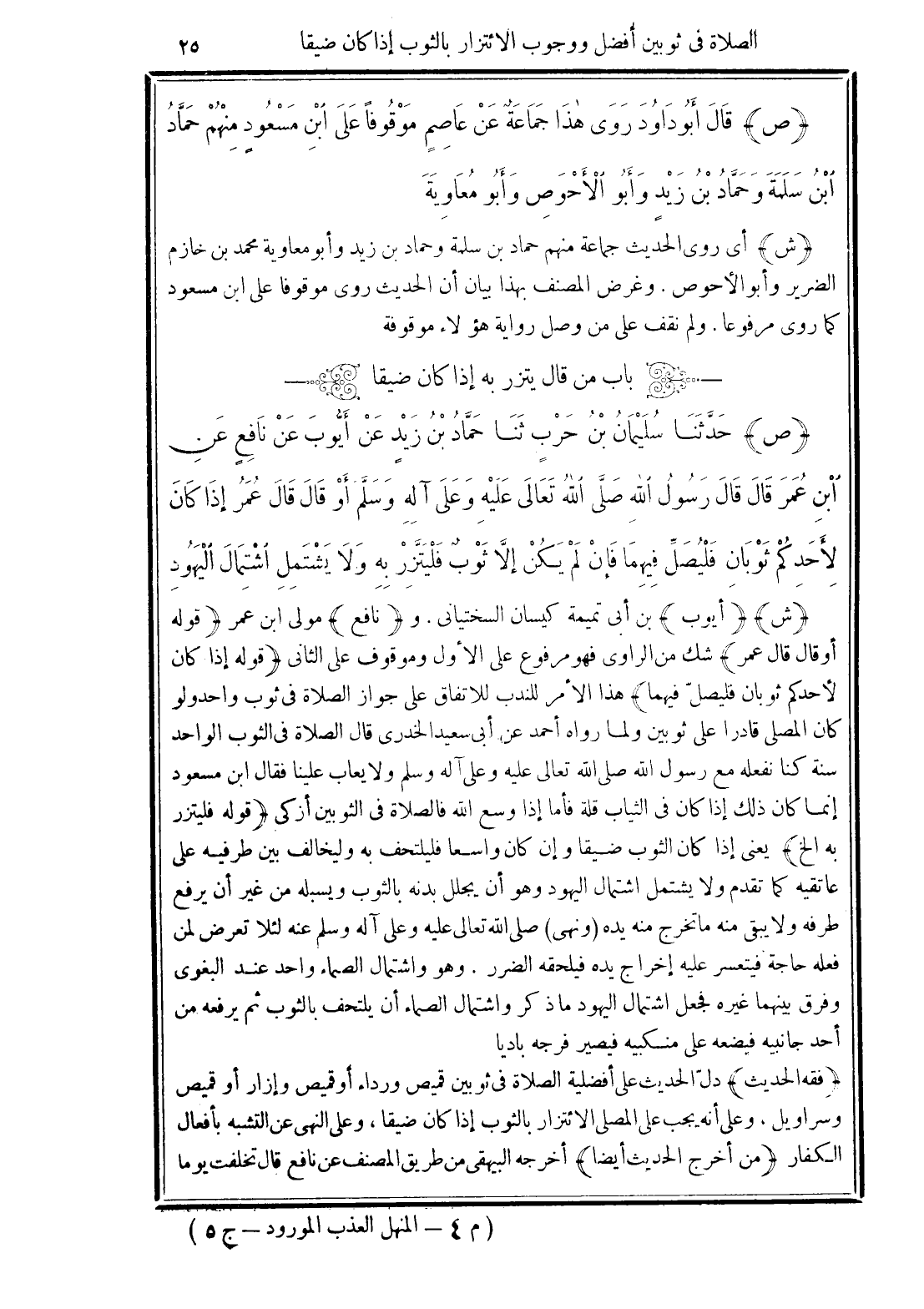 (ص) حَدَّثَنَا سُلَيْمَانُ بْنُ حَرْبٍ، ثَنَا حَمَّادُ بْنُ زَيْدٍ، عَنْ أَيُّوبَ، عَنْ نَافِعٍ، عَنِ ابْنِ عُمَرَ، قَالَ: قَالَ رَسُولُ اللَّهِ صَلَّى اللهُ تَعَالَى عَلَيْهِ وَعَلَى آلِهِ وسَلَّمَ: أَوْ قَالَ: قَالَ عُمَرُ رَضِيَ اللَّهُ تَعَالَى عَنْهُ: «إِذَا كَانَ لِأَحَدِكُمْ ثَوْبَانِ فَلْيُصَلِّ فِيهِمَا فَإِنْ لَمْ يَكُنْ إِلَّا ثَوْبٌ فَلْيَتَّزِرْ بِهِ، وَلَا يَشْتَمِلْ اشْتِمَالَ الْيَهُودِ»