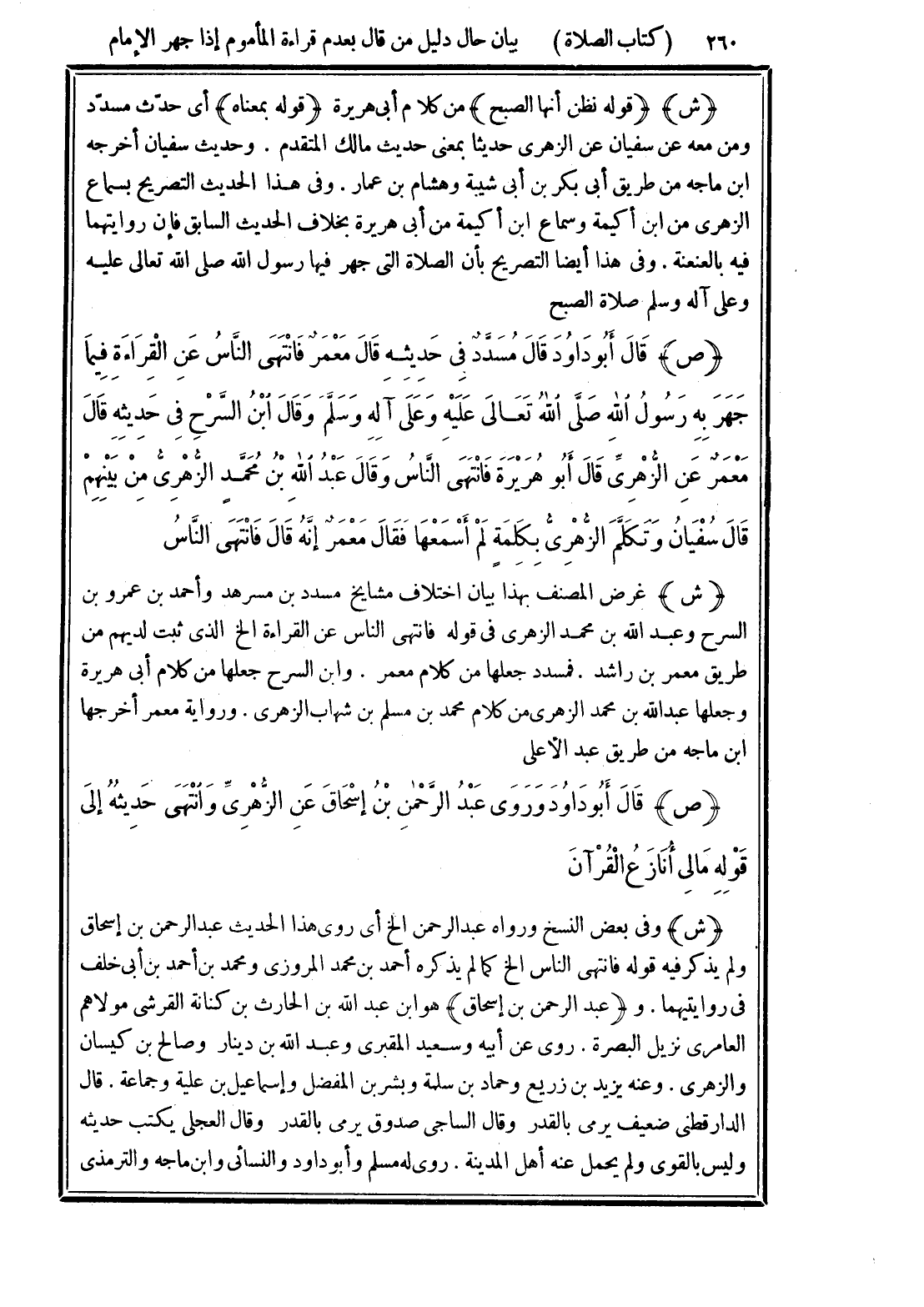 (ص) قَالَ أَبُو دَاودَ قَالَ مُسَدَّدٌ فِي حَدِيثِهِ: قَالَ مَعْمَرٌ: فَانْتَهَى النَّاسُ عَنِ الْقِرَاءَةِ فِيمَا جَهَرَ بِهِ رَسُولُ اللَّهِ صَلَّى اللهُ تَعَالَى عَلَيْهِ وَعَلَى آلِهِ وسَلَّمَ، وَقَالَ ابْنُ السَّرْحِ فِي حَدِيثِهِ: قَالَ مَعْمَرٌ: عَنِ الزُّهْرِيِّ، قَالَ أَبُو هُرَيْرَةَ: فَانْتَهَى النَّاسُ، وَقَالَ عَبْدُ اللَّهِ بْنُ مُحَمَّدٍ الزُّهْرِيُّ: مِنْ بَيْنِهِمْ، قَالَ سُفْيَانُ: وَتَكَلَّمَ الزُّهْرِيُّ بِكَلِمَةٍ لَمْ أَسْمَعْهَا، فَقَالَ مَعْمَرٌ: إِنَّهُ قَالَ: فَانْتَهَى النَّاسُ.