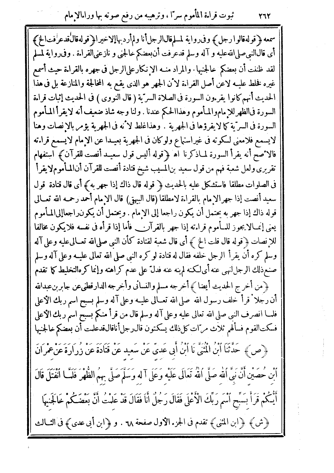 (ص) حَدَّثَنَا ابْنُ الْمُثَنَّى، نَا ابْنُ أَبِي عَدِيٍّ، عَنْ سَعِيدٍ، عَنْ قَتَادَةَ، عَنْ زُرَارَةَ، عَنْ عِمْرَانَ بْنِ حُصَيْنٍ، أَنَّ نَبِيَّ اللَّهِ صَلَّى اللهُ تَعَالَى عَلَيْهِ وَعَلَى آلِهِ وسَلَّمَ صَلَّى بِهِمُ الظُّهْرَ فَلَمَّا انْفَتَلَ، قَالَ: «أَيُّكُمْ قَرَأَ بِسَبِّحِ اسْمَ رَبِّكَ الْأَعْلَى؟ »، فَقَالَ رَجُلٌ: أَنَا، فَقَالَ: «عَلِمْتُ أَنَّ بَعْضَكُمْ خَالَجَنِيهَا»