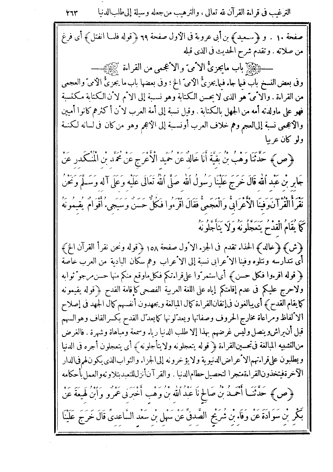 (ص) حَدَّثَنَا وَهْبُ بْنُ بَقِيَّةَ، أَنَا خَالِدٌ، عَنْ حُمَيْدٍ الْأَعْرَجِ، عَنْ مُحَمَّدِ بْنِ الْمُنْكَدِرِ، عَنْ جَابِرِ بْنِ عَبْدِ اللَّهِ، قَالَ: خَرَجَ عَلَيْنَا رَسُولُ اللَّهِ صَلَّى اللهُ تَعَالَى عَلَيْهِ وَعَلَى آلِهِ وسَلَّمَ وَنَحْنُ نَقْرَأُ الْقُرْآنَ وَفِينَا الْأَعْرَابِيُّ وَالعَجَمِيُّ، فَقَالَ: «اقْرَءُوا فَكُلٌّ حَسَنٌ وَسَيَجِيءُ أَقْوَامٌ يُقِيمُونَهُ كَمَا يُقَامُ الْقِدْحُ يَتَعَجَّلُونَهُ وَلَا يَتَأَجَّلُونَهُ»