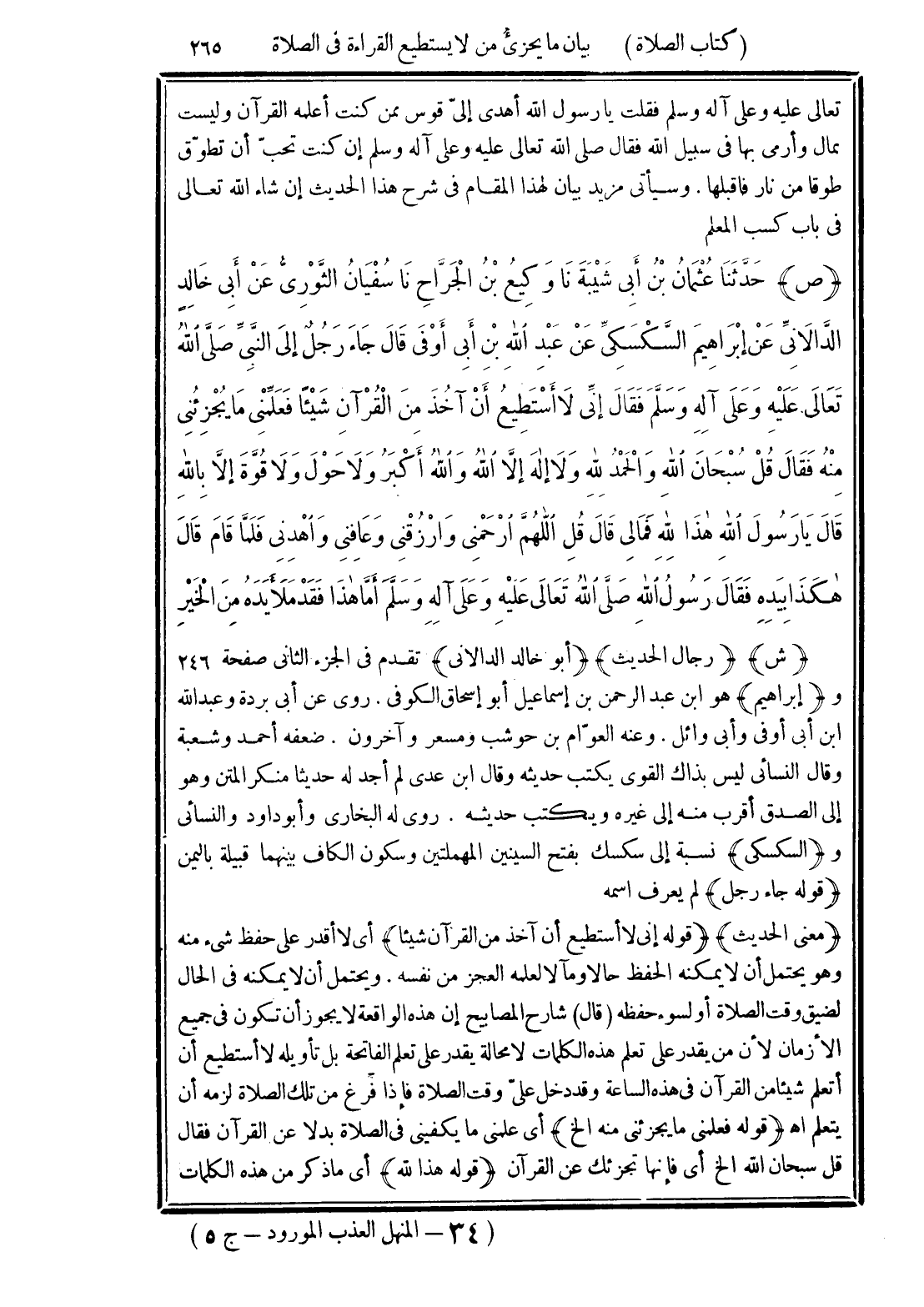 (ص) حَدَّثَنَا عُثْمَانُ بْنُ أَبِي شَيْبَةَ، نَا وَكِيعُ بْنُ الْجَرَّاحِ، نَا سُفْيَانُ الثَّوْرِيُّ، عَنْ أَبِي خَالِدٍ الدَّالَانِيِّ، عَنْ إِبْرَاهِيمَ السَّكْسَكِيِّ، عَنْ عَبْدِ اللَّهِ بْنِ أَبِي أَوْفَى، قَالَ: جَاءَ رَجُلٌ إِلَى النَّبِيِّ صَلَّى اللهُ تَعَالَى عَلَيْهِ وَعَلَى آلِهِ وَسَلَّمَ فَقَالَ: إِنِّي لَا أَسْتَطِيعُ أَنْ آخُذَ مِنَ الْقُرْآنِ شَيْئًا فَعَلِّمْنِي مَا يُجْزِئُنِي مِنْهُ، فقَالَ: " قُلْ: سُبْحَانَ اللَّهِ، وَالْحَمْدُ لِلَّهِ، وَلَا إِلَهَ إِلَّا اللَّهُ، وَاللَّهُ أَكْبَرُ، وَلَا حَوْلَ وَلَا قُوَّةَ إِلَّا بِاللَّهِ "، قَالَ: يَا رَسُولَ اللَّهِ، هَذَا لِلَّهِ فَمَا لِي، قَالَ: " قُلْ: اللَّهُمَّ ارْحَمْنِي وَارْزُقْنِي وَعَافِنِي وَاهْدِنِي "، فَلَمَّا قَامَ قَالَ: هَكَذَا بِيَدِهِ فَقَالَ رَسُولُ اللَّهِ صَلَّى اللهُ تَعَالَى عَلَيْهِ وَعَلَى آلِهِ وسَلَّمَ: «أَمَّا هَذَا فَقَدْ مَلَأَ يَدَهُ مِنَ الْخَيْرِ»
