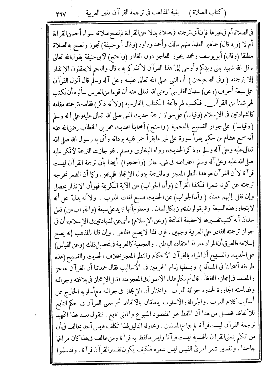 في الصلاة أم في غيرها فإن أتي بترجمته في صلاة بدلا عن القراءة لم تصح صلاته سواء أحسن القراءة أم لا (وبه قال) جماهير العلماء منهم مالك وأحمد وداود (وقال أبو حنيفة) تجوز وتصح به الصلاة مطلقا (وقال) أبو يوسف ومحمد يجوز للعاجز دون القادر (واحتج) لأبى حنيفة بقول الله تعالى "قل الله شهيد بينى وبينكم وأوحي إليّ هذا القرآن لأنذركم به" قال والعجم لا يعقلون الإنذار إلا بترجمته (وفي الصحيحين) أن النبي صلى الله تعالى عليه وعلى آله وسلم قال أنزل القرآن على سبعة أحرف (وعن) سلمان الفارسى رَضِيَ اللَّهُ تَعَالَى عَنْهُ أن قوما من الفرس سألوه أن يكتب لهم شيئا من القرآن فكتب لهم فاتحة الكتاب بالفارسية (ولأنه ذكر) فقامت ترجمته مقامه كالشهادتين في الإسلام (وقياسا) على جواز ترجمة حديث النبي صلى الله تعالى عليه وعلى آله وسلم (وقياسا) على جواز التسبيح بالعجمية (واحتج) أصحابنا بحديث عمر بن الخطاب رَضِيَ اللَّهُ تَعَالَى عَنْهُأنه سمع هشام بن حكيم يقرأ سورة على غير ما يقرأ عمر فلببه بردائه وأتى به رسول الله صلى الله تعالى عليه وعلى آله وسلم "وذكر الحديث" رواه البخارى ومسلم. فلو جازت الترجمة لأنكر عليه صلى الله عليه وعلى آله وسلم اعتراضه في شئ جائز (واحتجوا) أيضا بأن ترجمة القرآن ليست قرآنا لأن القرآن هو هذا النظم المعجز وبالترجمة يزول الإعجاز فلم يجز. وكما أن الشعر تخرجه ترجمته عن كونه شعرا فكذا القرآن (وأما الجواب) عن الآية الكريمة فهو أن الإنذار يحصل وإن نقل إليهم معناه (وأما الجواب) عن الحديث فسبع لغات للعرب. ولأنه يدل على أنه لا يتجاوز هذه السبعة وهم يقولون يجوز بكل لسان. ومعلوم أنها تزيد على سبعة (والجواب عن) فعل سلمان أنه كتب تفسيرها لا حقيقة الفاتحة (وعن الإسلام) "أى عن الشهادتين في الإسلام" أن في حواز ترجمته للقادر على العربية وجهين. فإن قلنا لا يصح فظاهر. وإن قلنا بالمذهب إنه يصح إسلامه فالفرق أن المراد معرفة اعتقاده الباطن. والعجمية كالعربية في تحصيل ذلك (وعن القياس) على الحديث والتسبيح أن المراد بالقرآن الأحكام والنظم المعجز بخلاف الحديث والتسبيح (هذه طريقة أصحابنا في المسألة) وبسطها إمام الحرمين في الأساليب فقال عمدتنا أن القرآن معجز والمعتمد في إعجازه اللفظ. قال ثم تكلم علماء الأصول في المعجز منه فقيل الإعجاز في بلاغته وجزالته وفصاحته المجاوزة لحدود جزالة العرب. والمختار أن الإعجاز في جزالته مع أسلوبه الخارج عن أساليب كلام العرب. والجزالة والأسلوب يتعلقان بالألفاظ ثم معنى القرآن في حكم التابع للألفاظ فحصل من هذا أن اللفظ هو المقصود المتبوع والمعنى تابع. فنقول بعد هذا التمهيد ترجمة القرآن ليست قرآنا بإجماع المسلمين. ومحاولة الدليل لهذا تكلف فليس أحد يخالف في أن من تكلم بمعنى القرآن بالهندية ليست قرآنا وليس ما لفظ به قرآنا ومن خالف في هذا كان مراغما جاحدا. وتفسير شعر امرئ القيس ليس شعره فكيف يكون تفسير القرآن قرآنا. وقد سلموا