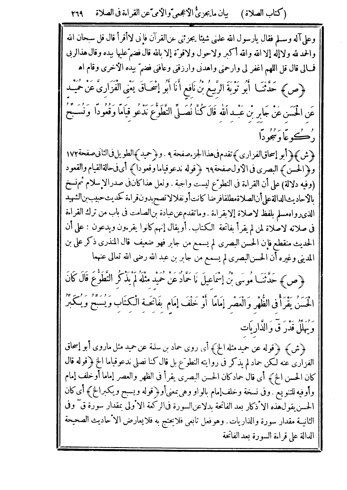 (ص) حَدَّثَنَا أَبُو تَوْبَةَ الرَّبِيعُ بْنُ نَافِعٍ، أَنَا أَبُو إِسْحَاقَ يَعْنِي الْفَزَارِيَّ، عَنْ حُمَيْدٍ، عَنِ الْحَسَنِ، عَنْ جَابِرِ بْنِ عَبْدِ اللَّهِ، قَالَ: «كُنَّا نُصَلِّي التَّطَوُّعَ نَدْعُو قِيَامًا وَقُعُودًا، وَنُسَبِّحُ رُكُوعًا وَسُجُودًا».