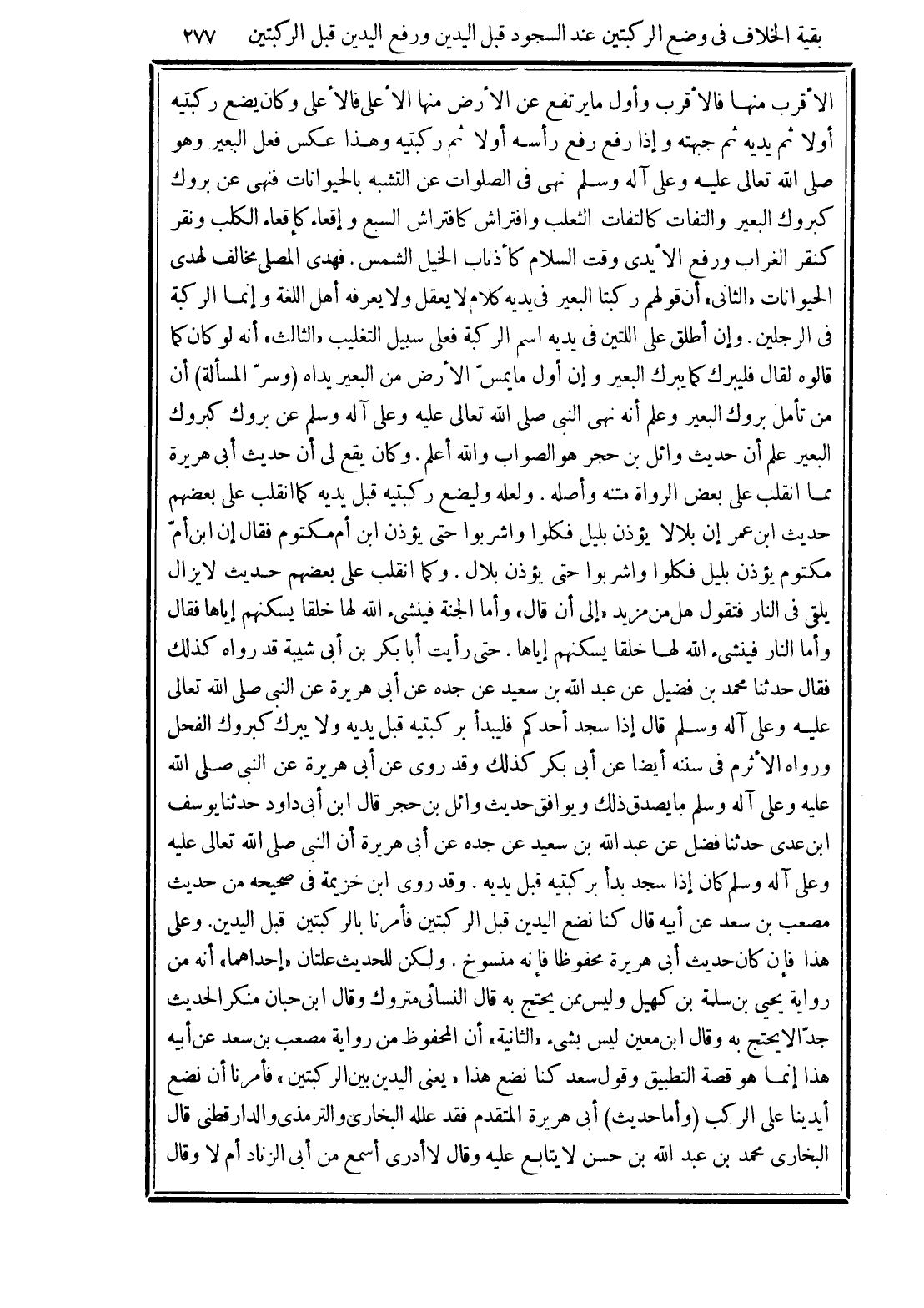 الأقرب منها فالأقرب وأول ما يرتفع عن الأرض منها الأعلى فالأعلى وكان يضع ركبتيه أولا ثم يديه ثم جبهته وإذا رفع رفع رأسه أولا ثم ركبتيه وهذا عكس فعل البعير وهو صلى الله تعالى عليه وعلى آله وسلم نهى في الصلوات عن التشبه بالحيوانات فنهى عن بروك كبروك البعير والتفات كالتفات الثعلب وافتراش كافتراش السبع وإقعاء كإقعاء الكلب ونقر كنقر الغراب ورفع الأيدى وقت السلام كأذناب الخيل الشمس. فهدى المصلى مخالف لهدى الحيوانات "الثانى" أن قولهم ركبتا البعير في يديه كلام لا يعقل ولا يعرفه أهل اللغة وإنما الركبة في الرجلين. وإن أطلق على اللتين في يديه اسم الركبة فعلى سبيل التغليب "الثالث" أنه لو كان كما قالوه لقال فليبرك كما يبرك البعير وإن أول ما يمس الأرض من البعير يداه (وسر المسألة) أن من تأمل بروك البعير وعلم أنه نهى النبي صلى الله تعالى عليه وعلى آله وسلم عن بروك كبروك البعير علم أن حديث وائل بن حجر هو الصواب والله أعلم. وكان يقع لى أن حديث أبي هريرة مما انقلب على بعض الرواة متنه وأصله. ولعله وليضع ركبتيه قبل يديه كما انقلب على بعضهم حديث ابن عمر إن بلالا يؤذن بليل فكلوا واشربوا حتى يؤذن ابن أم مكتوم فقال إن ابن أم مكتوم يؤذن بليل فكلوا واشربوا حتى يؤذن بلال. وكما انقلب على بعضهم حديث لا يزال يلقى في النار فتقول هل من مزيد "إلى أن قال" وأما الجنة فينشئ الله لها خلقا يسكنهم إياها فقال وأما النار فينشئ الله لها خلقا يسكنهم إياها. حتى رأيت أبا بكر بن أبى شيبة قد رواه كذلك فقال حدثنا محمد بن فضيل عن عبد الله بن سعيد عن جده عن أبى هريرة عن النبى صلى الله تعالى عليه وعلى آله وسلم قال إذا سجد أحدكم فليبدأ بركبتيه قبل يديه ولا يبرك كبروك الفحل ورواه الأثرم في سننه أيضا عن أبي بكر كذلك وقد روى عن أبى هريرة عن النبي صلى الله عليه وعلى آله وسلم ما يصدق ذلك ويوافق حديث وائل بن حجر قال ابن أبى داود حدثنا يوسف ابن عدى حدثنا فضل عن عبد الله بن سعيد عن جده عن أبى هريرة أن النبي صلى الله تعالى عليه وعلى آله وسلم كان إذا سجد بدأ بركبتيه قبل يديه. وقد روى ابن خزيمة في صحيحه من حديث مصعب بن سعد عن أبيه قال كنا نضع اليدين قبل الركبتين فأمرنا بالركبتين قبل اليدين. وعلى هذا فإن كان حديث أبى هريرة محفوظا فإنه منسوخ. ولكن للحديث علتان "إحداهما" أنه من رواية يحيى بن سلمة بن كهيل وليس ممن يحتج به قال النسائى متروك وقال ابن حبان منكر الحديث جدًّا لا يحتج به وقال ابن معين ليس بشئ "الثانية" أن المحفوظ من رواية مصعب بن سعد عن أبيه هذا إنما هو قصة التطبيق وقول سعد كنا نضع هذا "يعنى اليدين بين الركبتين" فأمرنا أن نضع أيدينا على الركب (وأما حديث) أبى هريرة المتقدم فقد علله البخارى والترمذى والدارقطني قال البخارى محمد بن عبد الله بن حسن لا يتابع عليه وقال لا أدرى أسمع من أبى الزناد أم لا وقال