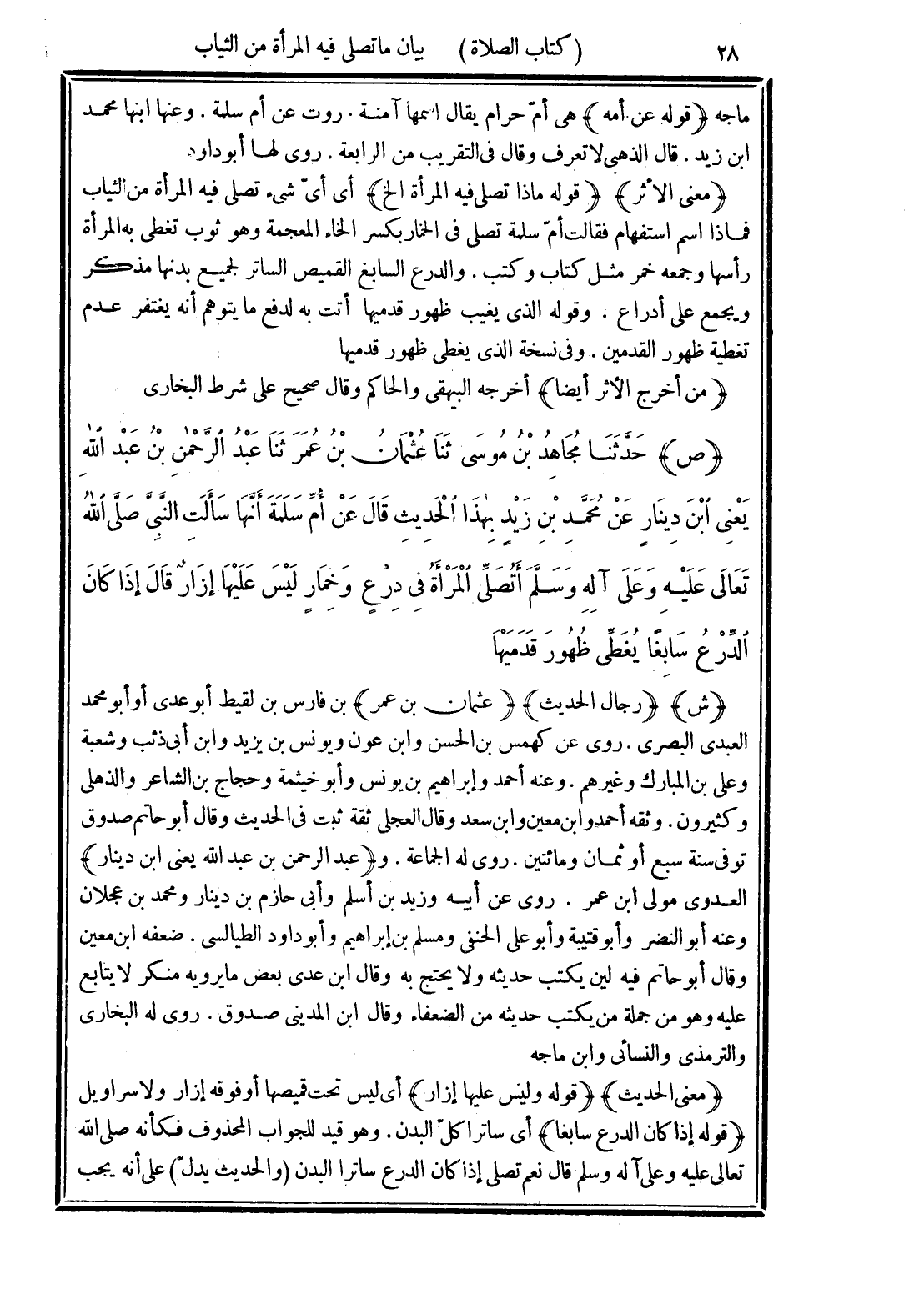 (ص) حَدَّثَنَا مُجَاهِدُ بْنُ مُوسَى، ثَنَا عُثْمَانُ بْنُ عُمَرَ، ثَنَا عَبْدُ الرَّحْمَنِ بْنُ عَبْدِ اللَّهِ يَعْنِي ابْنَ دِينَارٍ، عَنْ مُحَمَّدِ بْنِ زَيْدٍ -بِهَذَا الْحَدِيثِ- قَالَ: عَنْ أُمِّ سَلَمَةَ، أَنَّهَا سَأَلَتِ النَّبِيَّ صَلَّى اللهُ تَعَالَى عَلَيْهِ وَعَلَى آلِهِ وَسَلَّمَ: أَتُصَلِّي الْمَرْأَةُ فِي دِرْعٍ وَخِمَارٍ لَيْسَ عَلَيْهَا إِزَارٌ؟ ، قَالَ: «إِذَا كَانَ الدِّرْعُ سَابِغًا يُغَطِّي ظُهُورَ قَدَمَيْهَا».