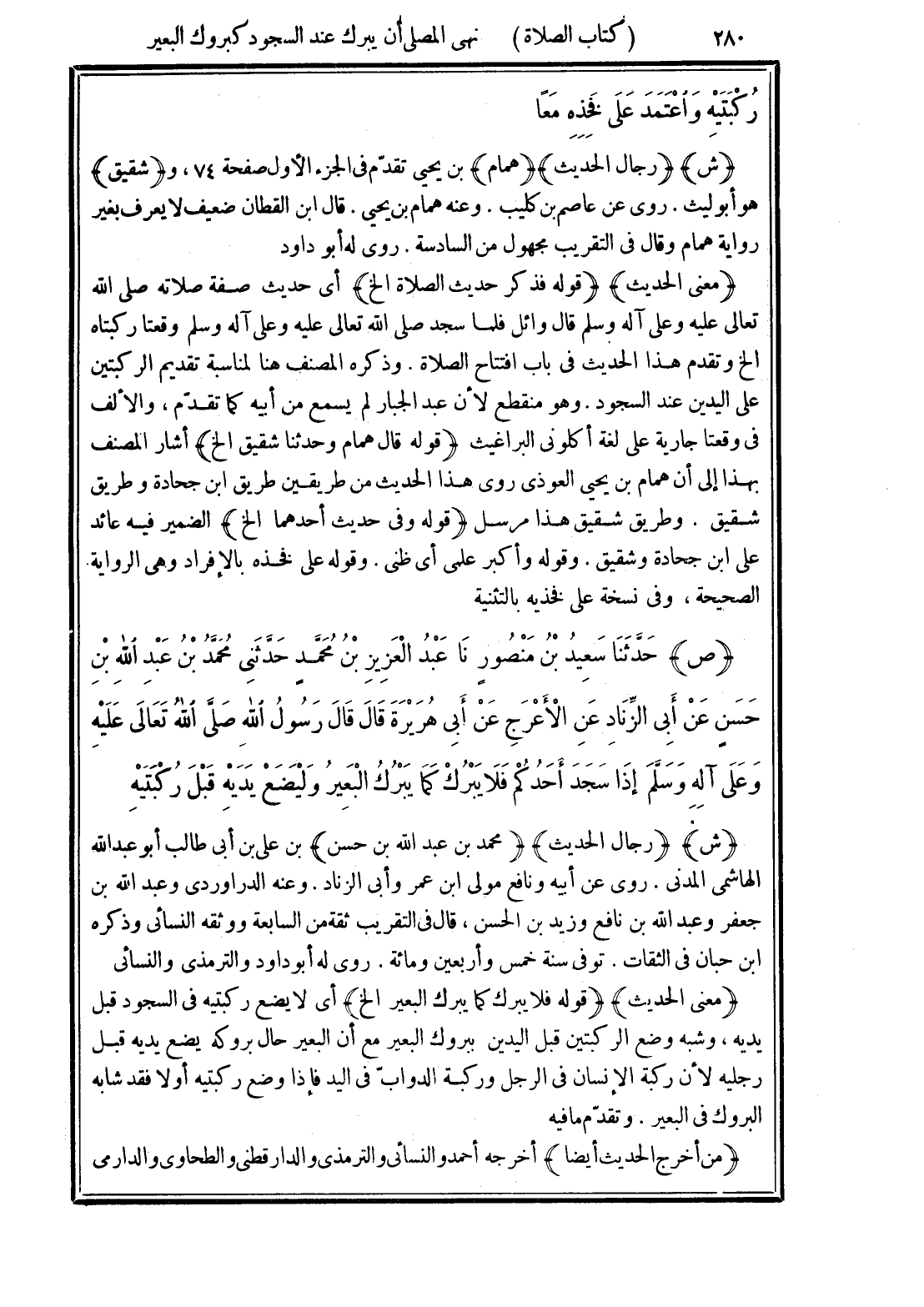 (ص) حَدَّثَنَا سَعِيدُ بْنُ مَنْصُورٍ، نَا عَبْدُ الْعَزِيزِ بْنُ مُحَمَّدٍ، حَدَّثَنِي مُحَمَّدُ بْنُ عَبْدِ اللَّهِ بْنِ حَسَنٍ، عَنْ أَبِي الزِّنَادِ، عَنِ الْأَعْرَجِ، عَنْ أَبِي هُرَيْرَةَ، قَالَ: قَالَ رَسُولُ اللَّهِ صَلَّى اللهُ تَعَالَى عَلَيْهِ وَسَلَّمَ: «إِذَا سَجَدَ أَحَدُكُمْ فَلَا يَبْرُكْ كَمَا يَبْرُكُ الْبَعِيرُ، وَلْيَضَعْ يَدَيْهِ قَبْلَ رُكْبَتَيْهِ»