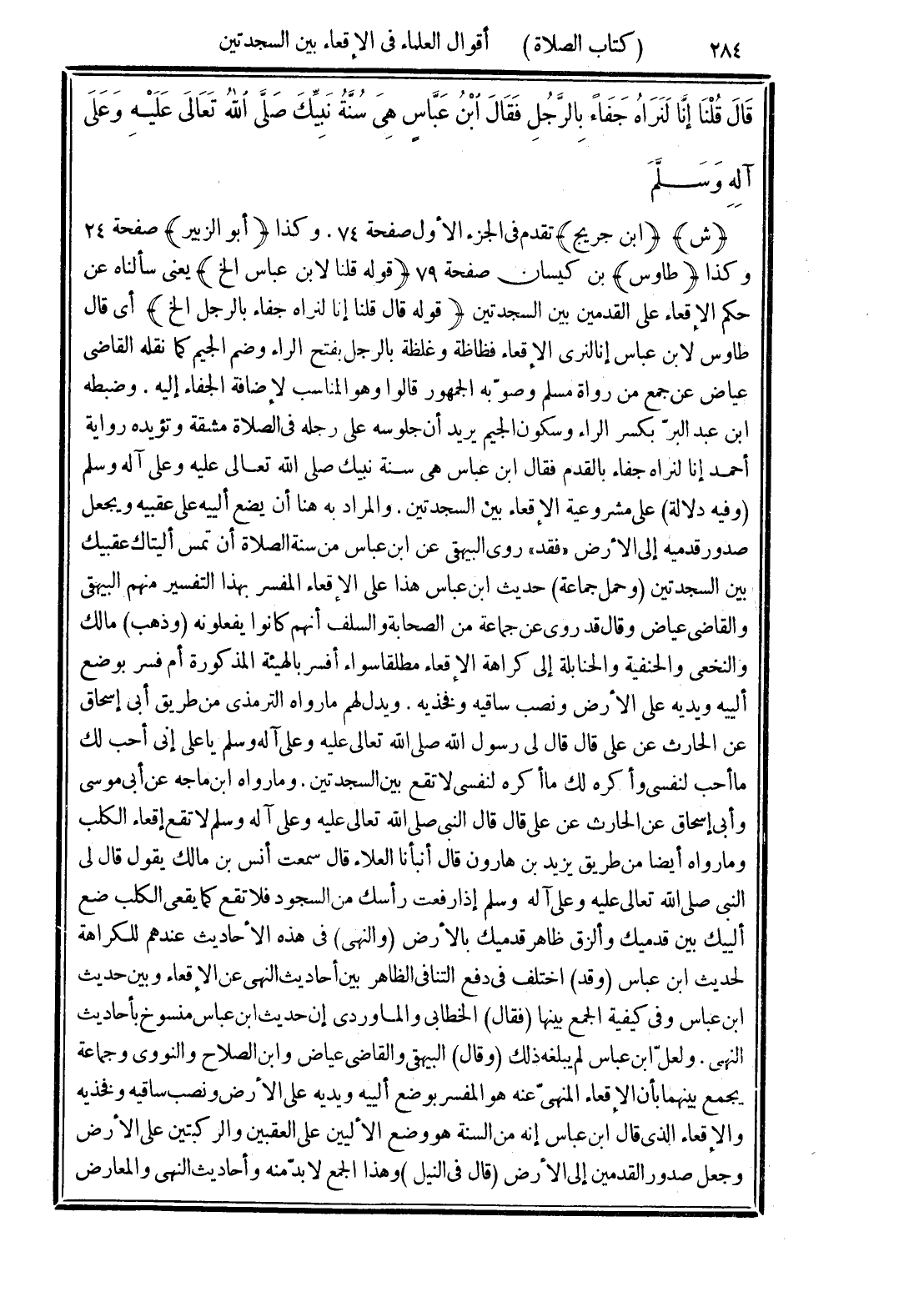 (قوله قال قلنا إنا لنراه جفاء بالرجل الخ) أى قال طاوس لابن عباس إنا لنرى الإقعاء فظاظة وغلظة بالرجل بفتح الراء وضم الجيم كما نقله القاضى عياض عن جمع من رواة مسلم وصوبه الجمهور قالوا وهو المناسب لإضافة الجفاء إليه. وضبطه ابن عبد البر بكسر الراء وسكون الجيم يريد أن جلوسه على رجله في الصلاة مشقة وتؤيده رواية أحمد إنا لنراه جفاء بالقدم فقال ابن عباس هي سنة نبيك صلى الله تعالى عليه وعلى آله وسلم (وفيه دلالة) على مشروعية الإقعاء بين السجدتين. والمراد به هنا أن يضع ألييه على عقبيه ويجعل صدور قدميه إلى الأرض "فقد" روى البيهقي عن ابن عباس من سنة الصلاة أن تمس أليتاك عقبيك بين السجدتين (وحمل جماعة) حديث ابن عباس هذا على الإقعاء المفسر بهذا التفسير منهم البيهقي والقاضى عياض وقال قد روى عن جماعة من الصحابة والسلف أنهم كانوا يفعلونه (وذهب) مالك والنخعى والحنفية والحنابلة إلى كراهة الإقعاء مطلقا سواء أفسر بالهيئة المذكورة أم فسر بوضع ألييه ويديه على الأرض ونصب ساقيه وفخذيه. ويدل لهم ما رواه الترمذى من طريق أبي إسحاق عن الحارث عن على قال قال لى رسول الله صلى الله تعالى عليه وعلى آله وسلم يا علي إني أحب لك ما أحب لنفسى وأكره لك ما أكره لنفسى لا تقع بين السجدتين. وما رواه ابن ماجه عن أبي موسى وأبي إسحاق عن الحارث عن علي قال قال النبي صلى الله تعالى عليه وعلى آله وسلم لا تقع إقعاء الكلب وما رواه أيضا من طريق يزيد بن هارون قال أنبأنا العلاء قال سمعت أنس بن مالك يقول قال لى النبى صلى الله تعالى عليه وعلى آله وسلم إذا رفعت رأسك من السجود فلا تقع كما يقعى الكلب ضع ألييك بين قدميك وألزق ظاهر قدميك بالأرض (والنهى) في هذه الأحاديث عندهم للكراهة لحديث ابن عباس (وقد) اختلف في دفع التنافي الظاهر بين أحاديث النهى عن الإقعاء وبين حديث ابن عباس وفى كيفية الجمع بينها (فقال) الخطابى والماوردى إن حديث ابن عباس منسوخ بأحاديث النهي. ولعل ابن عباس لم يبلغه ذلك (وقال) البيهقى والقاضى عياض وابن الصلاح والنووى وجماعة يجمع بينهما بأن الإقعاء المنهى عنه هو المفسر بوضع ألييه ويديه على الأرض ونصب ساقيه وفخذيه والإقعاء الذى قال ابن عباس إنه من السنة هو وضع الإليين على العقبين والركبتين على الأرض وجعل صدور القدمين إلى الأرض (قال في النيل) وهذا الجمع لا بدّ منه وأحاديث النهى والمعارض