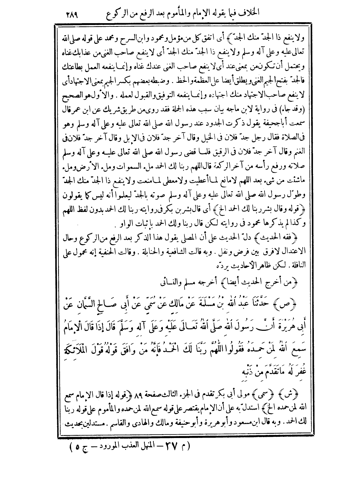 (فقه الحديث) دلّ الحديث على أن المصلى يقول هذا الذكر بعد الرفع من الركوع وحال الاعتدال لا فرق بين فرض ونفل. وبه قالت الشافعية والحنابلة. وقالت الحنفية إنه محمول على النافلة. لكن ظاهر الأحاديث يردّه