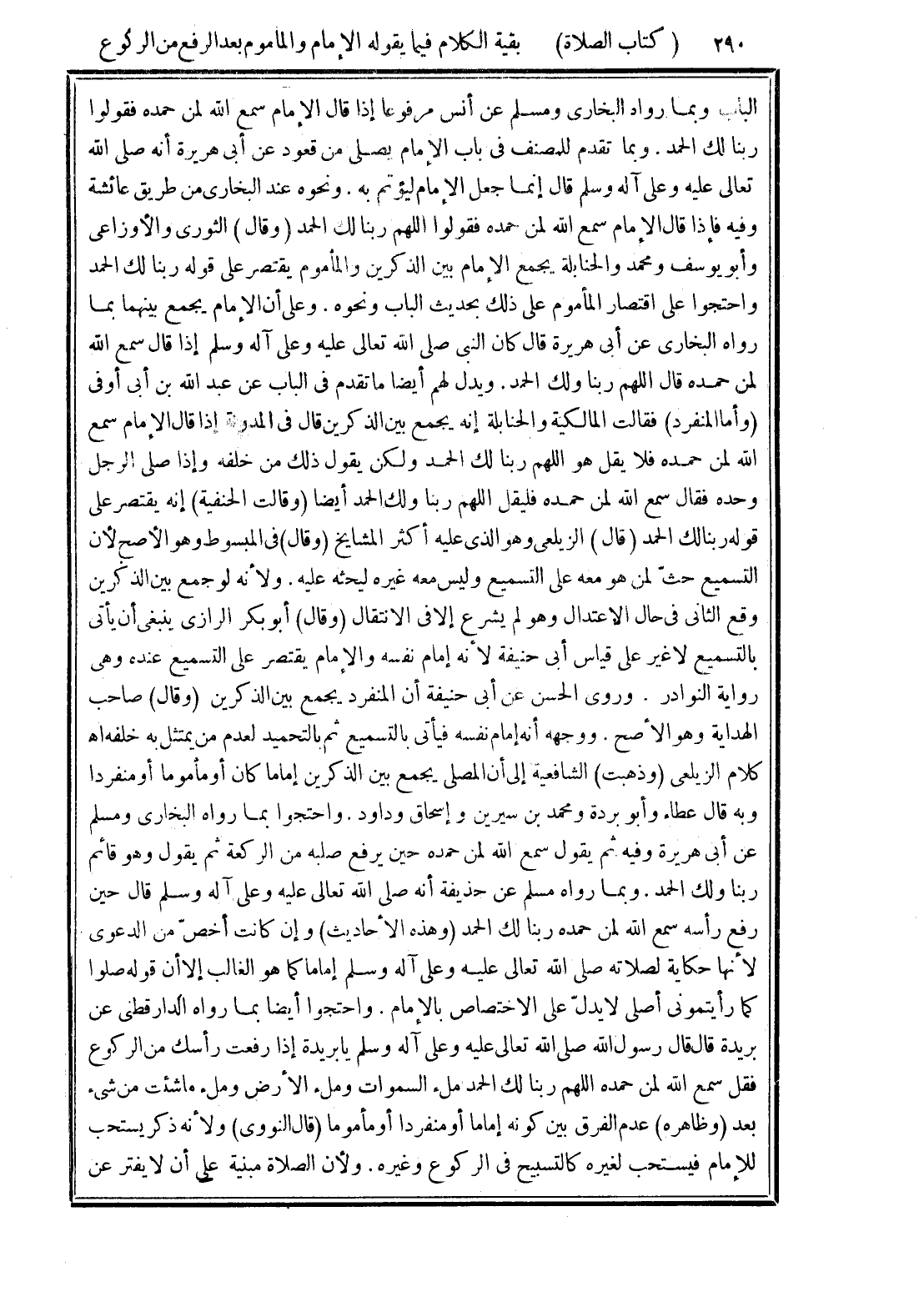 الباب وبما رواه البخارى ومسلم عن أنس مرفوعا إذا قال الإمام سمع الله لمن حمده فقولوا ربنا لك الحمد. وبما تقدم للمصنف في باب الإمام يصلى من قعود عن أبى هريرة أنه صلى الله تعالى عليه وعلى آله وسلم قال إنما جعل الإمام ليؤتم به. ونحوه عند البخارى من طريق عائشة وفيه فإذا قال الإمام سمع الله لمن حمده فقولوا اللهم ربنا لك الحمد (وقال) الثورى والأوزاعي وأبو يوسف ومحمد والحنابلة يجمع الإمام بين الذكرين والمأموم يقتصر على قوله ربنا لك الحمد واحتجوا على اقتصار المأموم على ذلك بحديث الباب ونحوه. وعلى أن الإمام يجمع بينهما بما رواه البخارى عن أبى هريرة قال كان النبى صلى الله تعالى عليه وعلى آله وسلم إذا قال سمع الله لمن حمده قال اللهم ربنا ولك الحمد. ويدل لهم أيضا ما تقدم في الباب عن عبد الله بن أبى أوفى (وأما المنفرد) فقالت المالكية والحنابلة إنه يجمع بين الذكرين قال في المدونة إذا قال الإمام سمع الله لمن حمده فلا يقل هو اللهم ربنا لك الحمد ولكن يقول ذلك من خلفه وإذا صلى الرجل وحده فقال سمع الله لمن حمده فليقل اللهم ربنا ولك الحمد أيضا (وقالت الحنفية) إنه يقتصر على قوله ربنا لك الحمد (قال) الزيلعى وهو الذى عليه أكثر المشايخ (وقال) في المبسوط وهو الأصح لأن التسميع حث لمن هو معه على التسميع وليس معه غيره ليحثه عليه. ولأنه لو جمع بين الذكرين وقع الثاني في حال الاعتدال وهو لم يشرع إلا في الانتقال (وقال) أبو بكر الرازى ينبغى أن يأتي بالتسميع لا غير على قياس أبى حنيفة لأنه إمام نفسه والإمام يقتصر على التسميع عنده وهي رواية النوادر. وروى الحسن عن أبى حنيفة أن المنفرد يجمع بين الذكرين (وقال) صاحب الهداية وهو الأصح. ووجهه أنه إمام نفسه فيأتي بالتسميع ثم بالتحميد لعدم من يمتثل به خلفه اهـ كلام الزيلعى (وذهبت) الشافعية إلى أن المصلى يجمع بين الذكرين إماما كان أو مأموما أو منفردا وبه قال عطاء وأبو بردة ومحمد بن سيرين وإسحاق وداود. واحتجوا بما رواه البخارى ومسلم عن أبى هريرة وفيه ثم يقول سمع الله لمن حمده حين يرفع صلبه من الركعة ثم يقول وهو قائم ربنا ولك الحمد. وبما رواه مسلم عن حذيفة أنه صلى الله تعالى عليه وعلى آله وسلم قال حين رفع رأسه سمع الله لمن حمده ربنا لك الحمد (وهذه الأحاديث) وإن كانت أخص من الدعوى لأنها حكاية لصلاته صلى الله تعالى عليه وعلى آله وسلم إماما كما هو الغالب إلا أن قوله صلوا كما رأيتمونى أصلى لا يدلّ على الاختصاص بالإمام. واحتجوا أيضا بما رواه الدارقطنى عن بريدة قال قال رسول الله صلى الله تعالى عليه وعلى آله وسلم يا بريدة إذا رفعت رأسك من الركوع فقل سمع الله لمن حمده اللهم ربنا لك الحمد ملء السماوات وملء الأرض وملء ما شئت من شيء بعد (وظاهره) عدم الفرق بين كونه إماما أو منفردا أو مأموما (قال النووى) ولأنه ذكر يستحب للإمام فيستحب لغيره كالتسبيح في الركوع وغيره. ولأن الصلاة مبنية على أن لا يفتر عن