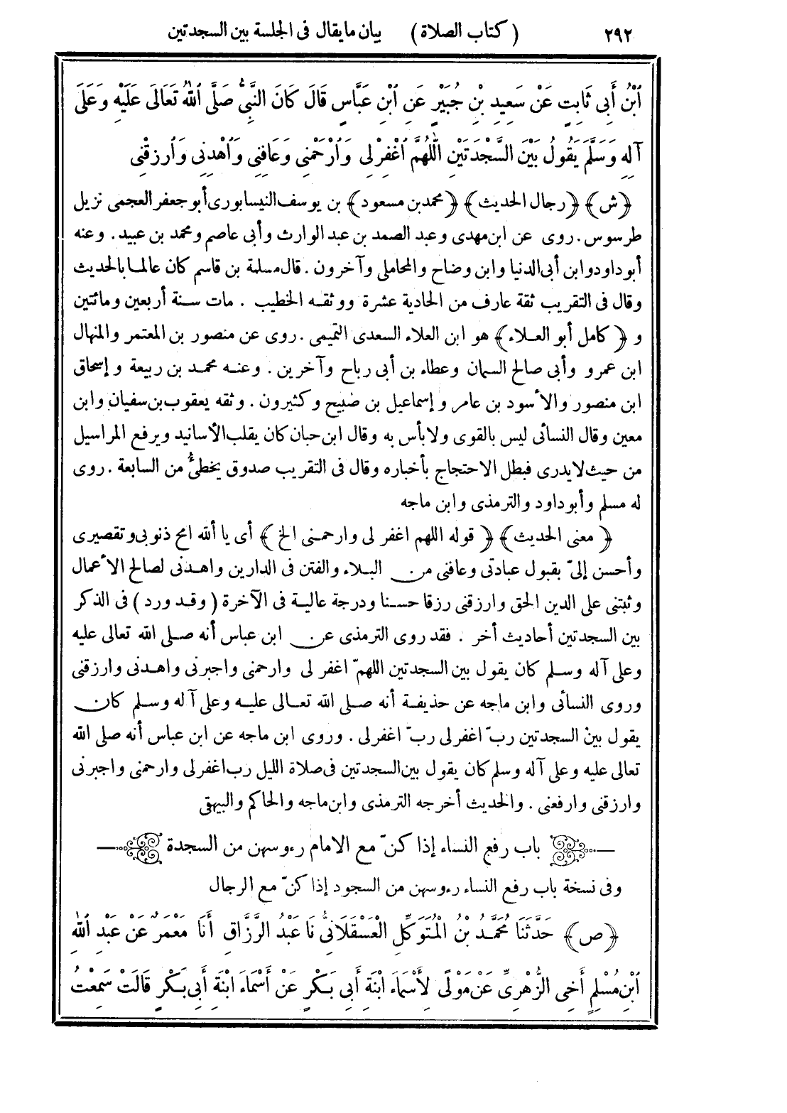 ابْنُ أَبِي ثَابِتٍ، عَنْ سَعِيدِ بْنِ جُبَيْرٍ، عَنِ ابْنِ عَبَّاسٍ قال كان النَّبِيَّ صَلَّى اللهُ تَعَالَى عَلَيْهِ وَسَلَّمَ كَانَ يَقُولُ بَيْنَ السَّجْدَتَيْنِ: «اللَّهُمَّ اغْفِرْ لِي، وَارْحَمْنِي، وَعَافِنِي، وَاهْدِنِي، وَارْزُقْنِي»