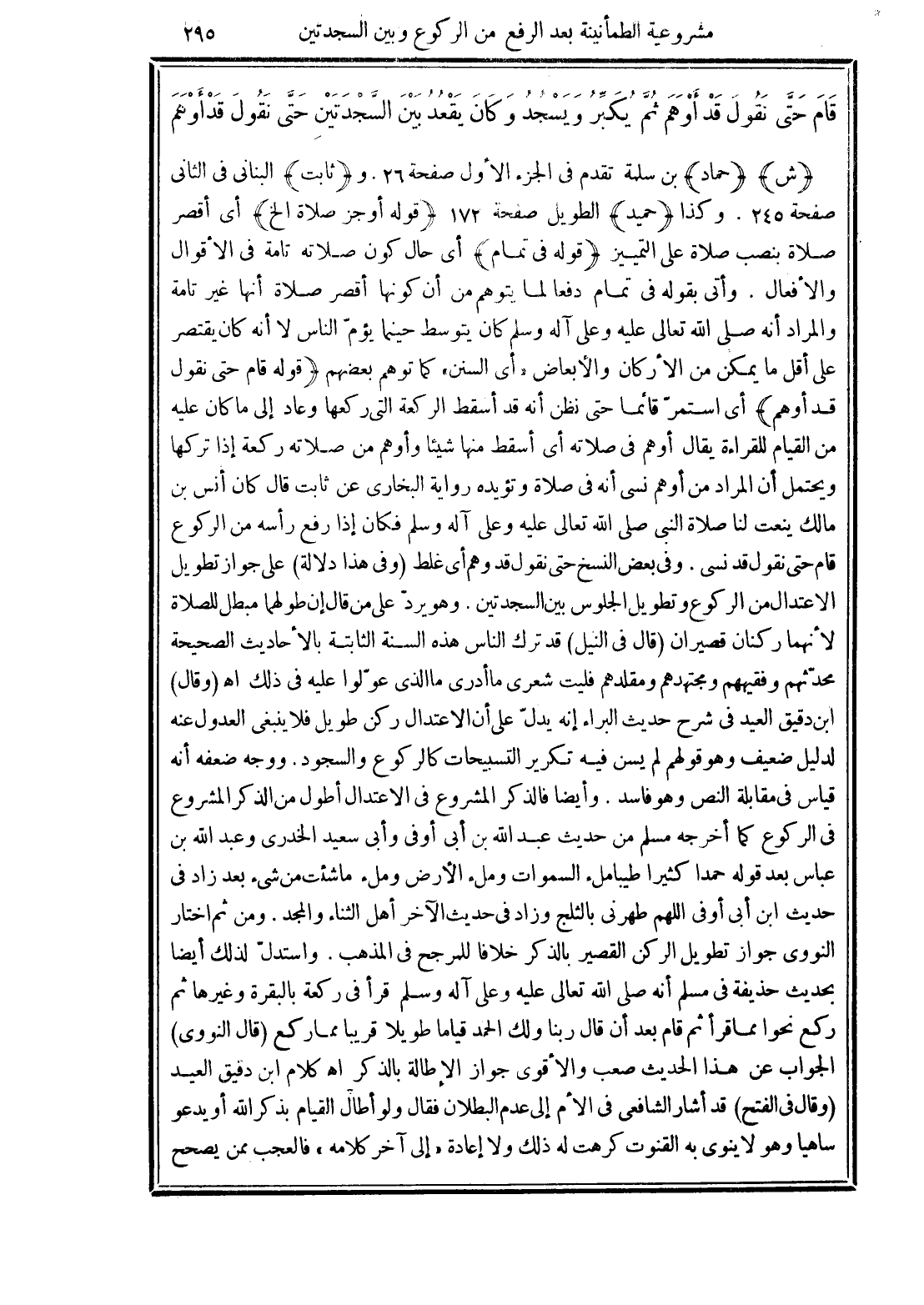(قوله قام حتى نقول قد أوهم) أى استمر قائما حتى نظن أنه قد أسقط الركعة التي ركعها وعاد إلى ما كان عليه من القيام للقراءة يقال أوهم في صلاته أى أسقط منها شيئا وأوهم من صلاته ركعة إذا تركها ويحتمل أن المراد من أوهم نسى أنه في صلاة وتؤيده رواية البخارى عن ثابت قال كان أنس بن مالك ينعت لنا صلاة النبى صلى الله تعالى عليه وعلى آله وسلم فكان إذا رفع رأسه من الركوع قام حتى نقول قد نسى. وفي بعض النسخ حتى نقول قد وهم أى غلط (وفي هذا دلالة) على جواز تطويل الاعتدال من الركوع وتطويل الجلوس بين السجدتين. وهو يردّ على من قال إن طولهما مبطل للصلاة لأنهما ركنان قصيران (قال في النيل) قد ترك الناس هذه السنة الثابتة بالأحاديث الصحيحة محدّثهم وفقيههم ومجتهدهم ومقلدهم فليت شعرى ما أدرى ما الذى عولوا عليه في ذلك اهـ (وقال) ابن دقيق العيد في شرح حديث البراء إنه يدل على أن الاعتدال ركن طويل فلا ينبغى العدول عنه لدليل ضعيف وهو قولهم لم يسن فيه تكرير التسبيحات كالركوع والسجود. ووجه ضعفه أنه قياس في مقابلة النص وهو فاسد. وأيضا فالذكر المشروع في الاعتدال أطول من الذكر المشروع في الركوع كما أخرجه مسلم من حديث عبد الله بن أبى أوفى وأبى سعيد الخدرى وعبد الله بن عباس بعد قوله حمدا كثيرا طيبا ملء السماوات وملء الأرض وملء ما شئت من شئ بعد زاد في حديث ابن أبى أوفى اللهم طهرني بالثلج وزاد في حديث الآخر أهل الثناء والمجد. ومن ثم اختار النووى جواز تطويل الركن القصير بالذكر خلافا للمرجح في المذهب. واستدل لذلك أيضا بحديث حذيفة في مسلم أنه صلى الله تعالى عليه وعلى آله وسلم قرأ في ركعة بالبقرة وغيرها ثم ركع نحوا مما قرأ ثم قام بعد أن قال ربنا ولك الحمد قياما طويلا قريبا مما ركع (قال النووى) الجواب عن هذا الحديث صعب والأقوى جواز الإطالة بالذكر اهـ كلام ابن دقيق العيد (وقال في الفتح) قد أشار الشافعى في الأم إلى عدم البطلان فقال ولو أطال القيام بذكر الله أو يدعو ساهيا وهو لا ينوى به القنوت كرهت له ذلك ولا إعادة "إلى آخر كلامه" فالعجب ممن يصحح