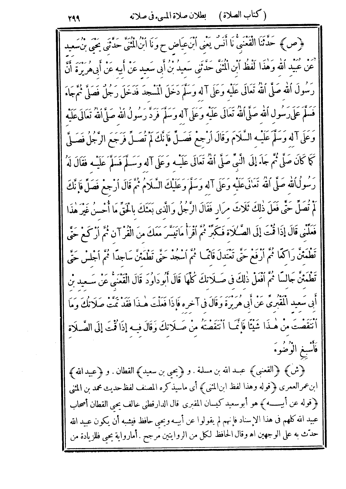 (ص) حَدَّثَنَا الْقَعْنَبِيُّ، نَا أَنَسٌ يَعْنِي ابْنَ عَيَّاضٍ، ح ونَا ابْنُ الْمُثَنَّى، حَدَّثَنِي يَحْيَى بْنُ سَعِيدٍ، عَنْ عُبَيْدِ اللَّهِ، وَهَذَا لَفْظُ ابْنِ الْمُثَنَّى، حَدَّثَنِي سَعِيدُ بْنُ أَبِي سَعِيدٍ، عَنْ أَبِيهِ، عَنْ أَبِي هُرَيْرَةَ، أَنَّ رَسُولَ اللَّهِ صَلَّى اللهُ تَعَالَى عَلَيْهِ وَعَلَى آلِهِ وسَلَّمَ دَخَلَ الْمَسْجِدَ، فَدَخَلَ رَجُلٌ، فَصَلَّى ثُمَّ جَاءَ فَسَلَّمَ عَلَى رَسُولِ اللَّهِ صَلَّى اللهُ تَعَالَى عَلَيْهِ وَعَلَى آلِهِ وسَلَّمَ، فَرَدَّ رَسُولُ اللَّهِ صَلَّى اللهُ تَعَالَى عَلَيْهِ وَسَلَّمَ عَلَيْهِ السَّلَامَ، وَقَالَ: «ارْجِعْ فَصَلِّ، فَإِنَّكَ لَمْ تُصَلِّ»، فَرَجَعَ الرَّجُلُ، فَصَلَّى كَمَا كَانَ صَلَّى، ثُمَّ جَاءَ إِلَى النَّبِيِّ صَلَّى اللهُ تَعَالَى عَلَيْهِ وَعَلَى آلِهِ وسَلَّمَ، فَسَلَّمَ عَلَيْهِ، فَقَالَ لَهُ رَسُولُ اللَّهِ صَلَّى اللهُ تَعَالَى عَلَيْهِ وَعَلَى آلِهِ وسَلَّمَ: «وَعَلَيْكَ السَّلَامُ»، ثُمَّ قَالَ: «ارْجِعْ فَصَلِّ، فَإِنَّكَ لَمْ تُصَلِّ»، حَتَّى فَعَلَ ذَلِكَ ثَلَاثَ مِرَارٍ، فَقَالَ الرَّجُلُ: وَالَّذِي بَعَثَكَ بِالْحَقِّ، مَا أُحْسِنُ غَيْرَ هَذَا فَعَلِّمْنِي، قَالَ: «إِذَا قُمْتَ إِلَى الصَّلَاةِ فَكَبِّرْ، ثُمَّ اقْرَأْ مَا تَيَسَّرَ مَعَكَ مِنَ الْقُرْآنِ، ثُمَّ ارْكَعْ حَتَّى تَطْمَئِنَّ رَاكِعًا، ثُمَّ ارْفَعْ حَتَّى تَعْتَدِلَ قَائِمًا، ثُمَّ اسْجُدْ حَتَّى تَطْمَئِنَّ سَاجِدًا، ثُمَّ اجْلِسْ حَتَّى تَطْمَئِنَّ جَالِسًا، ثُمَّ افْعَلْ ذَلِكَ فِي صَلَاتِكَ كُلِّهَا»، قَالَ أبو داود قال الْقَعْنَبِيُّ، عَنْ سَعِيدِ بْنِ أَبِي سَعِيدٍ الْمَقْبُرِيِّ، عَنْ أَبِي هُرَيْرَةَ، وَقَالَ فِي آخِرِهِ: «فَإِذَا فَعَلْتَ هَذَا فَقَدْ تَمَّتْ صَلَاتُكَ، وَمَا انْتَقَصْتَ مِنْ هَذَا شَيْئًا، فَإِنَّمَا انْتَقَصْتَهُ مِنْ صَلَاتِكَ»، وَقَالَ فِيهِ: إِذَا قُمْتَ إِلَى الصَّلَاةِ فَأَسْبِغِ الْوُضُوءَ