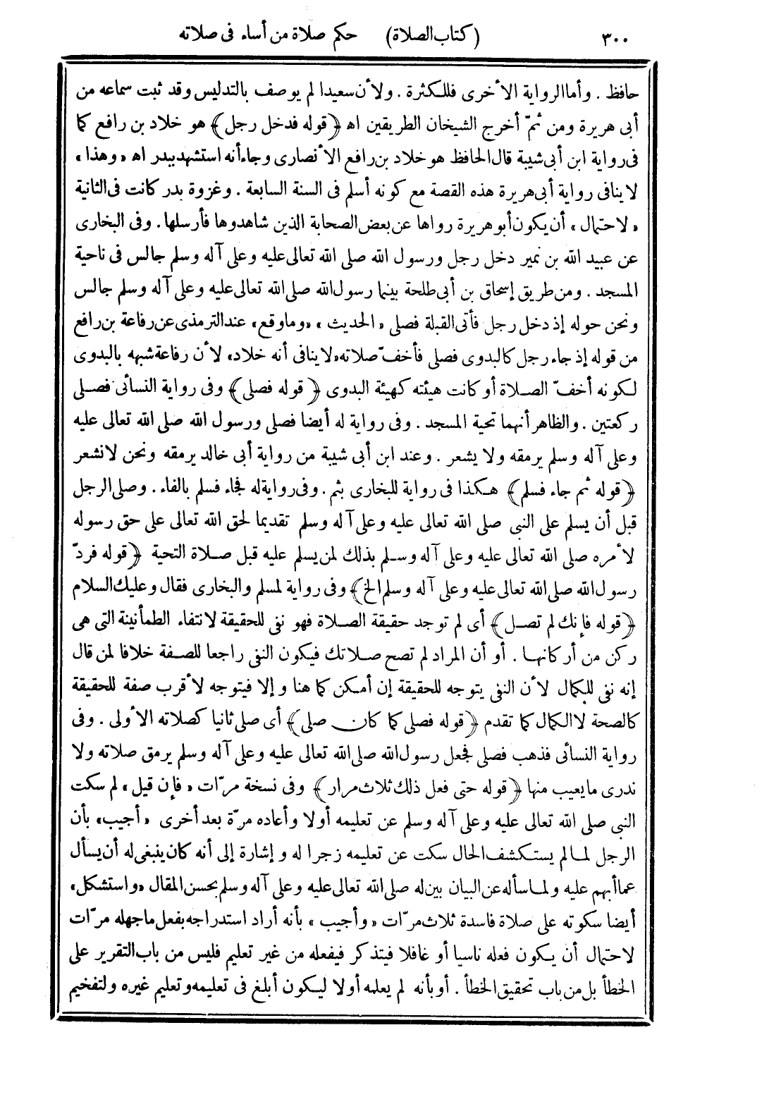 (قوله فدخل رجل) هو خلاد بن رافع كما في رواية ابن أبي شيبة قال الحافظ هو خلاد بن رافع الأنصارى وجاء أنه استشهد ببدر اهـ "وهذا" لا ينافي رواية أبي هريرة هذه القصة مع كونه أسلم في السنة السابعة. وغزوة بدر كانت في الثانية "لاحتمال" أن يكون أبو هريرة رواها عن بعض الصحابة الذين شاهدوها فأرسلها. وفي البخارى عن عبيد الله بن نمير دخل رجل ورسول الله صلى الله تعالى عليه وعلى آله وسلم جالس في ناحية المسجد. ومن طريق إسحاق بن أبي طلحة بينما رسول الله صلى الله تعالى عليه وعلى آله وسلم جالس ونحن حوله إذ دخل رجل فأتى القبلة فصلى "الحديث" "وما وقع" عند الترمذى عن رفاعة بن رافع من قوله إذ جاء رجل كالبدوى فصلى فأخف صلاته "لا ينافي أنه خلاد" لأن رفاعة شبهه بالبدوى لكونه أخفّ الصلاة أو كانت هيئته كهيئة البدوى