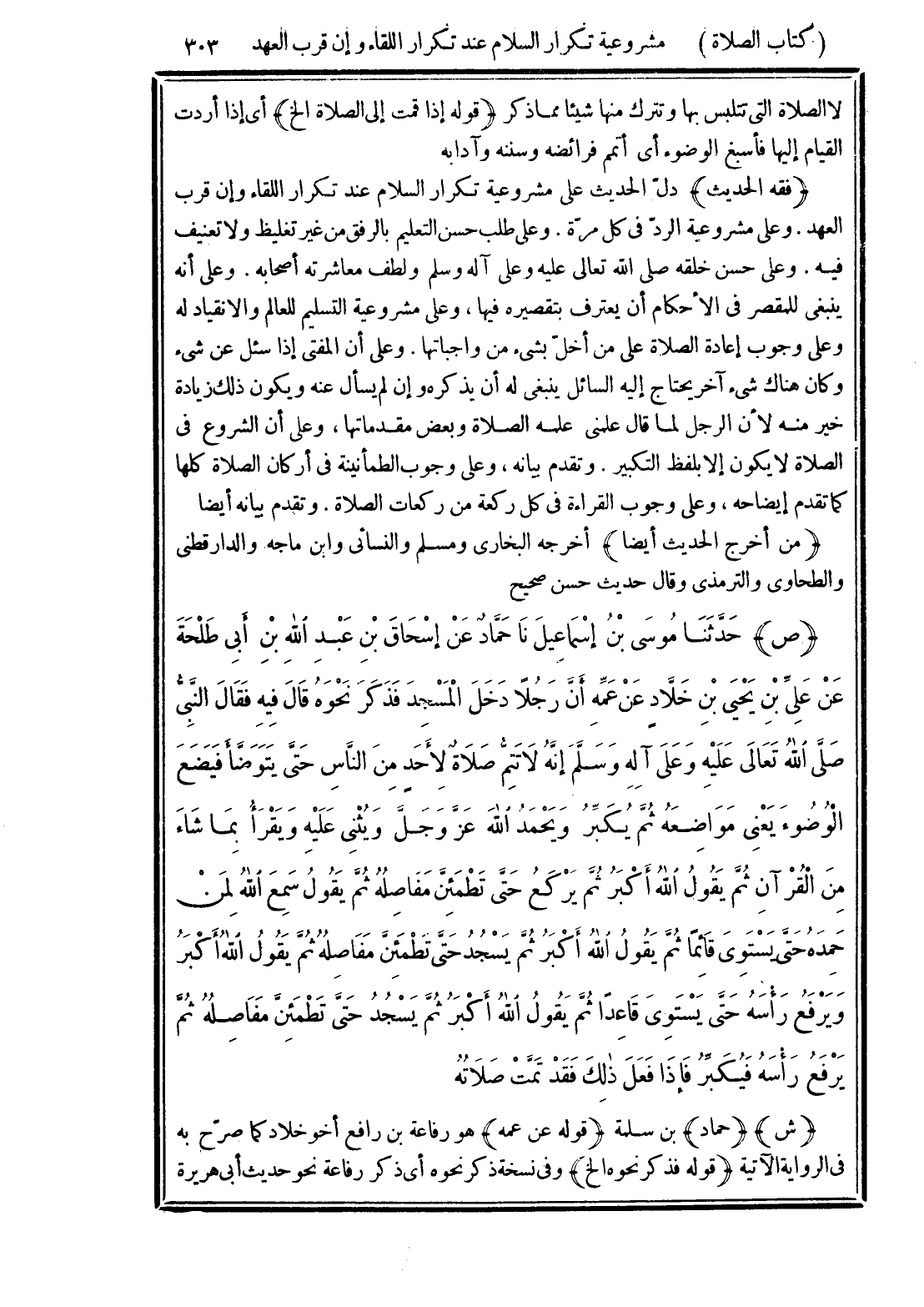 (فقه الحديث) دلّ الحديث على مشروعية تكرار السلام عند تكرار اللقاء وإن قرب العهد. وعلى مشروعية الردّ في كل مرة. وعلى طلب حسن التعليم بالرفق من غير تغليظ ولا تعنيف فيه. وعلى حسن خلقه صلى الله تعالى عليه، على آله وسلم ولطف معاشرته أصحابه. وعلى أنه ينبغى للمقصر في الأحكام أن يعترف بتقصيره فيها، وعلى مشروعية التسليم للعالم والانقياد له وعلى وجوب إعادة الصلاة على من أخلّ بشيء من واجباتها. وعلى أن المفتي إذا سئل عن شيء وكان هناك شيء آخر يحتاج إليه السائل ينبغى له أن بذكره وإن لم يسأل عنه ويكون ذلك زيادة خير منه لأن الرجل لما قال علمنى علمه الصلاة وبعض مقدماتها، وعلى أن الشروع في الصلاة لا يكون إلا بلفظ التكبير. وتقدم بيانه، وعلى وجوب الطمأنينة في أركان الصلاة كلها كما تقدم إيضاحه، وعلى وجوب القراءة في كل ركعة من ركعات الصلاة. وتقدم بيانه أيضا
