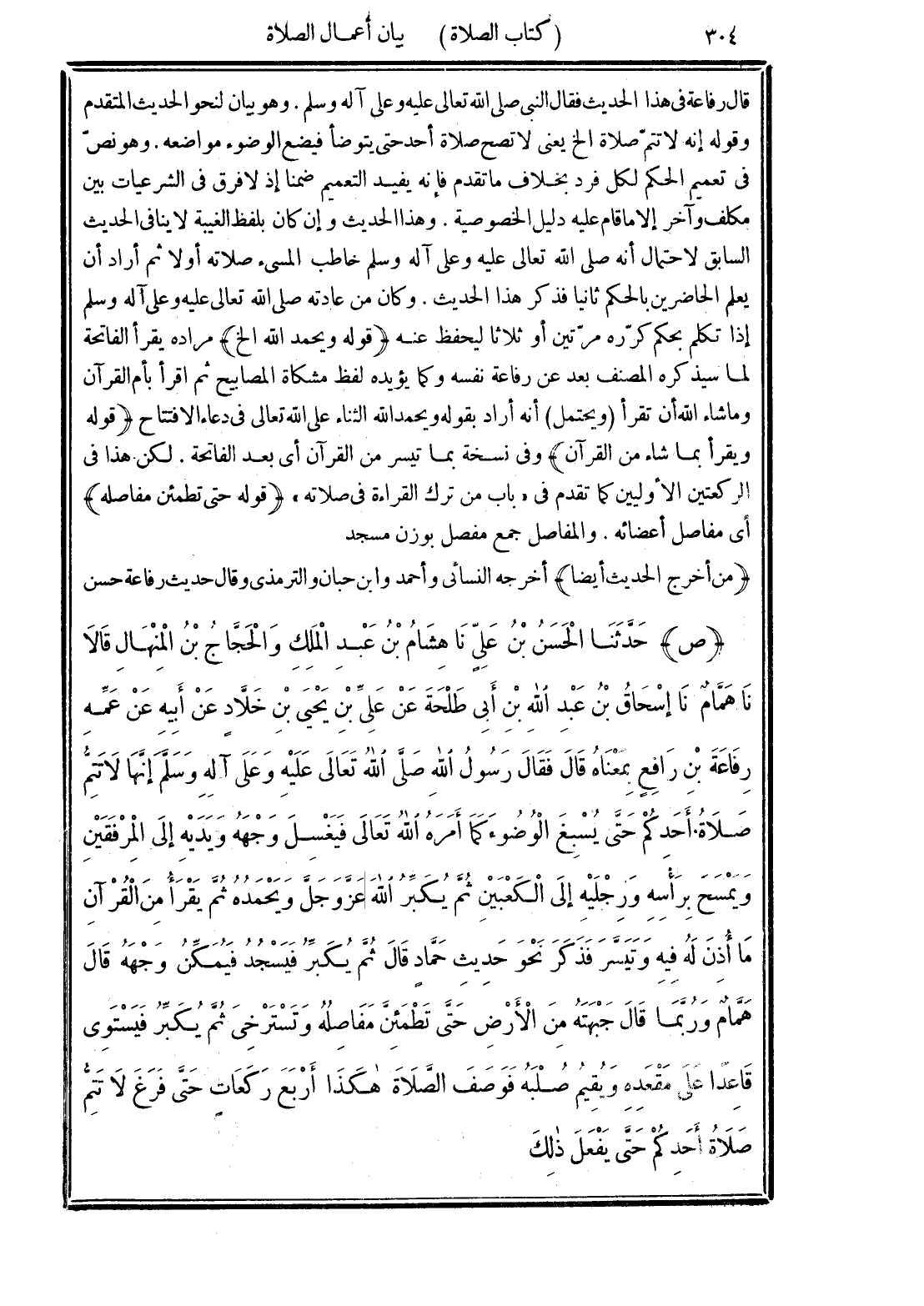 قال رفاعة في هذا الحديث فقال النبى صلى الله تعالى عليه وعلى آله وسلم. وهو بيان لنحو الحديث المتقدم وقوله إنه لا تتمّ صلاة الخ يعني لا تصح صلاة أحد حتى يتوضأ فيضع الوضوء مواضعه. وهو نصّ في تعميم الحكم لكل فرد بخلاف ما تقدم فإنه يفيد التعميم ضمنا إذ لا فرق في الشرعيات بين مكلف وآخر إلا ما قام عليه دليل الخصوصية. وهذا الحديث وإن كان بلفظ الغيبة لا ينافي الحديث السابق لاحتمال أنه صلى الله تعالى عليه وعلى آله وسلم خاطب المسئ صلاته أولا ثم أراد أن يعلم الحاضرين بالحكم ثانيا فذكر هذا الحديث. وكان من عادته صلى الله تعالى عليه وعلى آله وسلم إذا تكلم بحكم كرره مرتين أو ثلاثا ليحفظ عنه