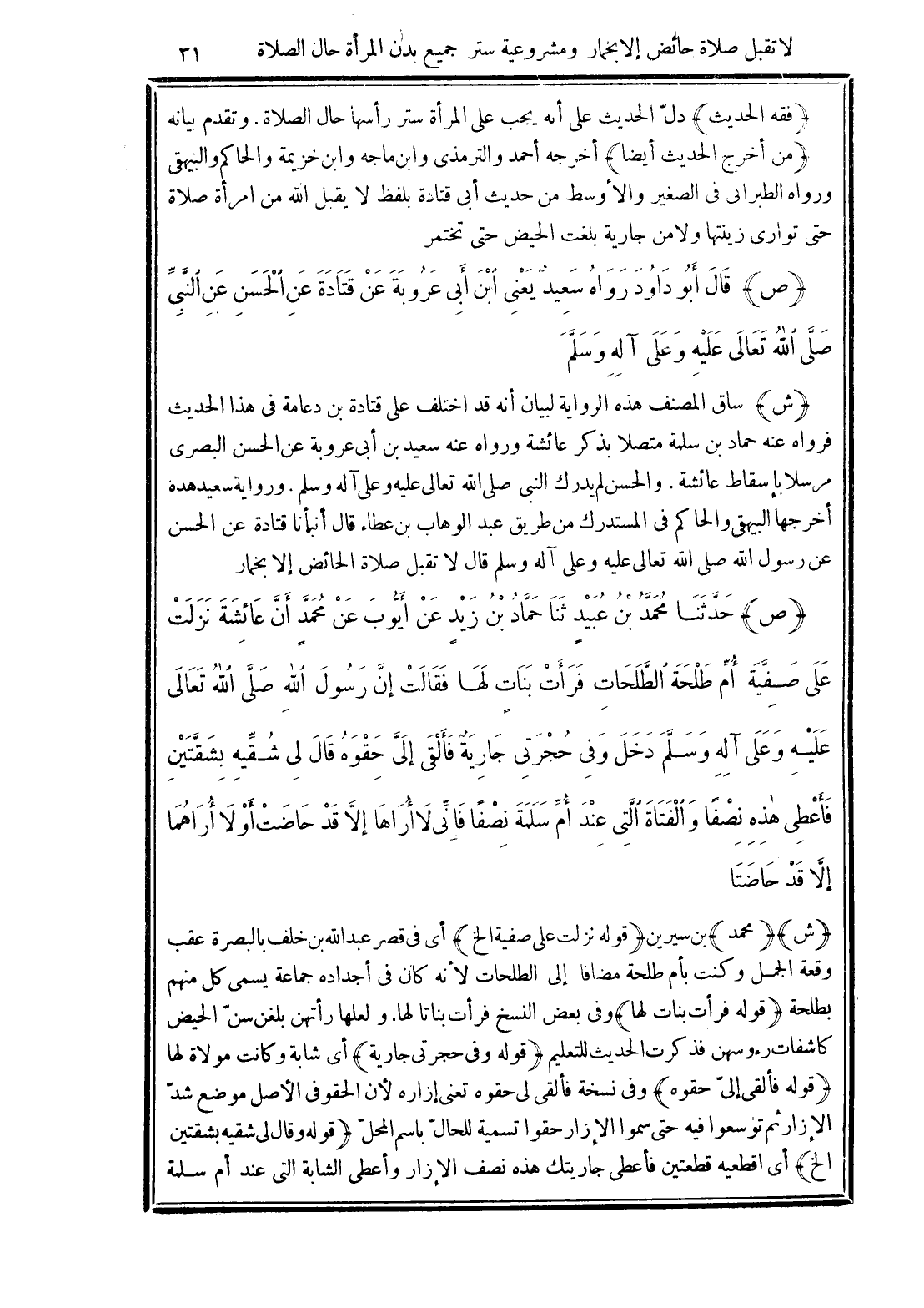 (ش) ساق المصنف هذه الرواية لبيان أنه قد اختلف على قتادة بن دعامة في هذا الحديث فرواه عنه حماد بن سلمة متصلا بذكر عائشة ورواه عنه سعيد بن أبى عروبة عن الحسن البصرى مرسلا بإسقاط عائشة. والحسن لم يدرك النبي صلى الله تعالى عليه وعلى آله وسلم. ورواية سعيد هذه أخرجها البيهقي والحاكم في المستدرك من طريق عبد الوهاب بن عطاء قال أنبأنا قتادة عن الحسن عن رسول الله صلى الله تعالى عليه وعلى آله وسلم قال لا تقبل صلاة الحائض إلا بخمار