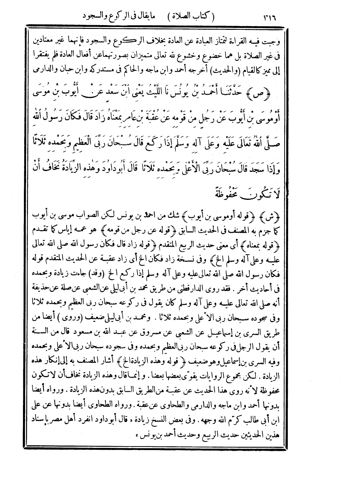 (ص) حَدَّثَنَا أَحْمَدُ بْنُ يُونُسَ، نَا اللَّيْثُ يَعْنِي ابْنَ سَعْدٍ، عَنْ أَيُّوبَ بْنِ مُوسَى أَوْ مُوسَى بْنِ أَيُّوبَ، عَنْ رَجُلٍ مِنْ قَوْمِهِ، عَنْ عُقْبَةَ بْنِ عَامِرٍ، بِمَعْنَاهُ زَادَ، قَالَ: فَكَانَ رَسُولُ اللَّهِ صَلَّى اللهُ تَعَالَى عَلَيْهِ وَعَلَى آلِهِ وسَلَّمَ إِذَا رَكَعَ قَالَ: «سُبْحَانَ رَبِّيَ الْعَظِيمِ وَبِحَمْدِهِ» ثَلَاثًا، وَإِذَا سَجَدَ قَالَ: «سُبْحَانَ رَبِّيَ الْأَعْلَى وَبِحَمْدِهِ» ثَلَاثًا، قَالَ أَبُو دَاوُدَ: «وَهَذِهِ الزِّيَادَةُ نَخَافُ أَنْ لَا تَكُونَ مَحْفُوظَةً».