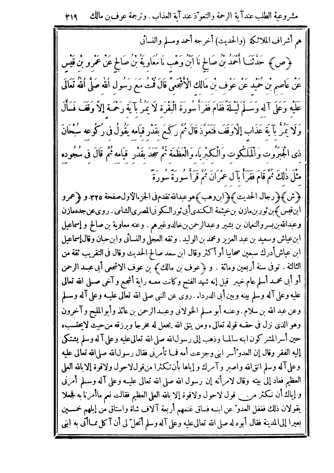 (ص) حَدَّثَنَا أَحْمَدُ بْنُ صَالِحٍ، حَدَّثَنَا ابْنُ وَهْبٍ، نَا مُعَاوِيَةُ بْنُ صَالِحٍ، عَنْ عَمْرِو بْنِ قَيْسٍ، عَنْ عَاصِمِ بْنِ حُمَيْدٍ، عَنْ عَوْفِ بْنِ مَالِكٍ الْأَشْجَعِيِّ، قَالَ: قُمْتُ مَعَ رَسُولِ اللَّهِ صَلَّى اللهُ تَعَالَى عَلَيْهِ وَعَلَى آلِهِ وَسَلَّمَ لَيْلَةً، فَقَامَ فَقَرَأَ سُورَةَ الْبَقَرَةِ، لَا يَمُرُّ بِآيَةِ رَحْمَةٍ إِلَّا وَقَفَ فَسَأَلَ، وَلَا يَمُرُّ بِآيَةِ عَذَابٍ إِلَّا وَقَفَ فَتَعَوَّذَ، قَالَ: ثُمَّ رَكَعَ بِقَدْرِ قِيَامِهِ، يَقُولُ فِي رُكُوعِهِ: «سُبْحَانَ ذِي الْجَبَرُوتِ وَالْمَلَكُوتِ وَالْكِبْرِيَاءِ وَالْعَظَمَةِ»، ثُمَّ سَجَدَ بِقَدْرِ قِيَامِهِ، ثُمَّ قَالَ فِي سُجُودِهِ مِثْلَ ذَلِكَ، ثُمَّ قَامَ فَقَرَأَ بِآلِ عِمْرَانَ، ثُمَّ قَرَأَ سُورَةً سُورَةً