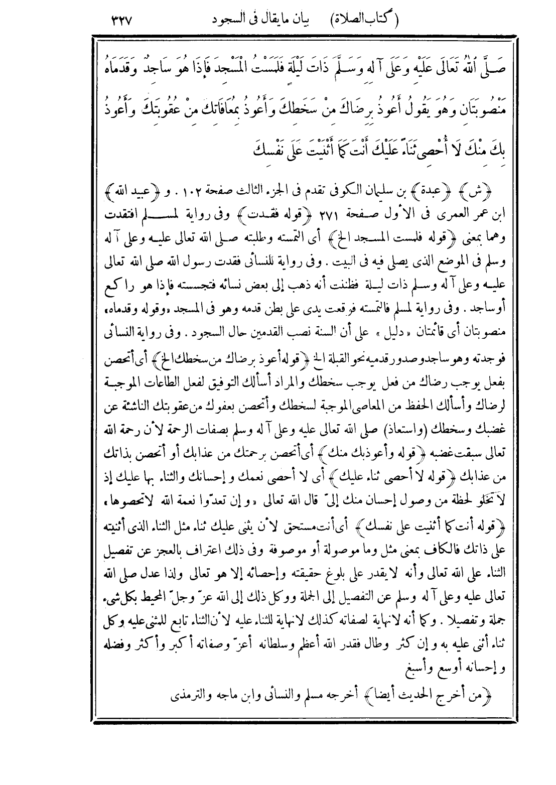 صَلَّى اللهُ تَعَالَى عَلَيْهِ وَعَلَى آلِهِ وسَلَّمَ ذَاتَ لَيْلَةٍ، فَلَمَسْتُ الْمَسْجِدَ، فَإِذَا هُوَ سَاجِدٌ وَقَدَمَاهُ مَنْصُوبَتَانِ، وَهُوَ يَقُولُ: «أَعُوذُ بِرِضَاكَ مِنْ سَخَطِكَ، وَأَعُوذُ بِمُعَافَاتِكَ مِنْ عُقُوبَتِكَ، وَأَعُوذُ بِكَ مِنْكَ، لَا أُحْصِي ثَنَاءً عَلَيْكَ، أَنْتَ كَمَا أَثْنَيْتَ عَلَى نَفْسِكَ»