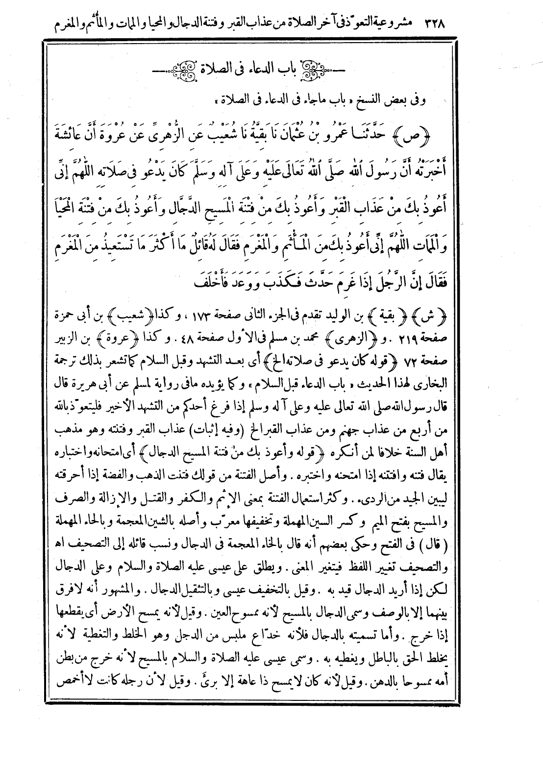 (ص) حَدَّثَنَا عَمْرُو بْنُ عُثْمَانَ، نَا بَقِيَّةُ، نَا شُعَيْبٌ، عَنِ الزُّهْرِيِّ، عَنْ عُرْوَةَ، أَنَّ عَائِشَةَ، أَخْبَرَتْهُ، أَنَّ رَسُولَ اللَّهِ صَلَّى اللهُ تَعَالَى عَلَيْهِ وَعَلَى آلِهِ وسَلَّمَ كَانَ يَدْعُو فِي صَلَاتِهِ: «اللَّهُمَّ إِنِّي أَعُوذُ بِكَ مِنْ عَذَابِ الْقَبْرِ، وَأَعُوذُ بِكَ مِنْ فِتْنَةِ الْمَسِيحِ الدَّجَّالِ، وَأَعُوذُ بِكَ مِنْ فِتْنَةِ الْمَحْيَا وَالْمَمَاتِ، اللَّهُمَّ إِنِّي أَعُوذُ بِكَ مِنَ المَأْثَمِ، وَالْمَغْرَمِ، » فَقَالَ لَهُ قَائِلٌ: مَا أَكْثَرَ مَا تَسْتَعِيذُ مِنَ الْمَغْرَمِ؟ ، فَقَالَ: «إِنَّ الرَّجُلَ إِذَا غَرِمَ حَدَّثَ فَكَذَبَ، وَوَعَدَ فَأَخْلَفَ»