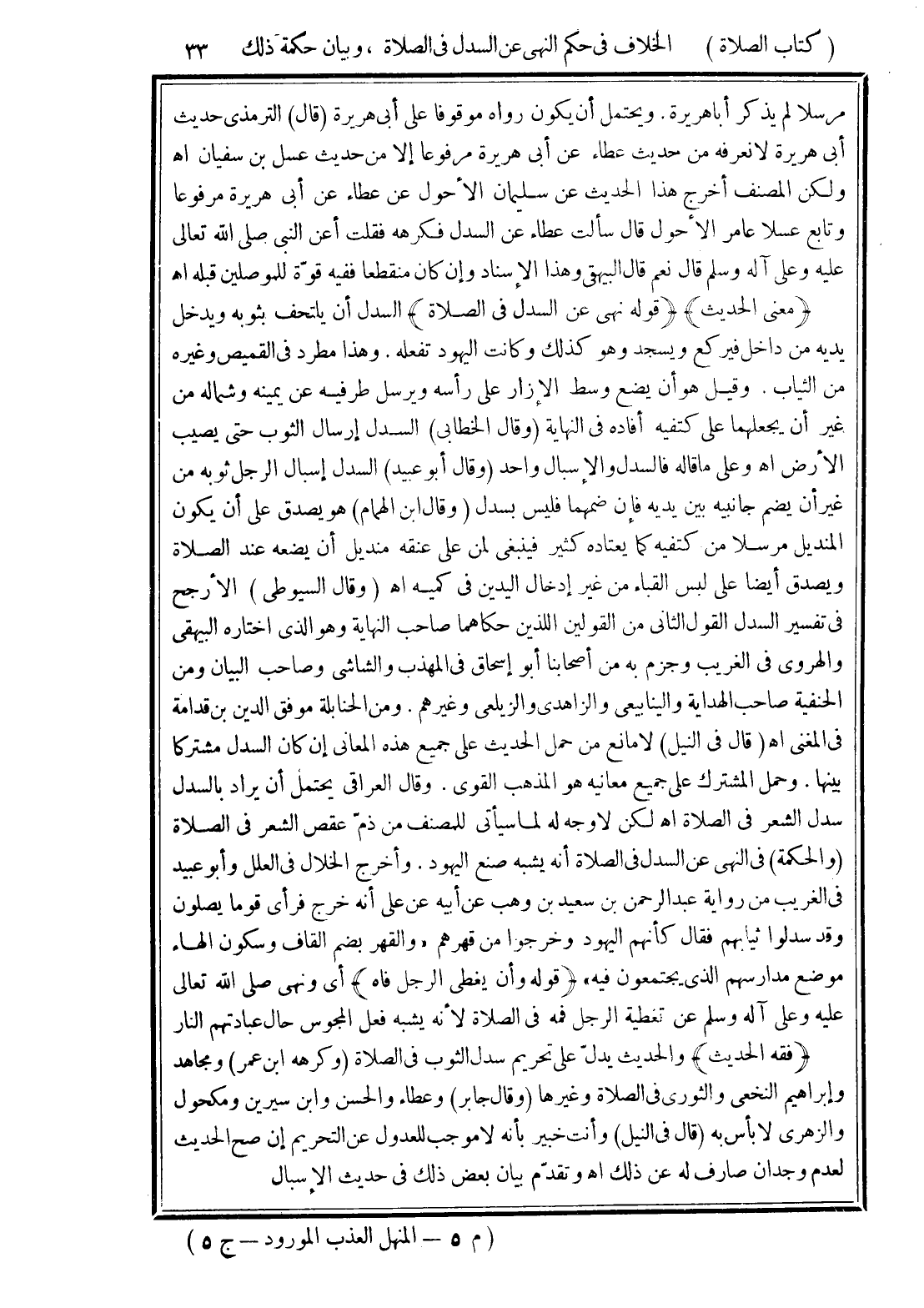 (قوله نهى عن السدل في الصلاة) السدل أن يلتحف بثوبه ويدخل يديه من داخل فيركع ويسجد وهو كذلك وكانت اليهود تفعله. وهذا مطرد في القميص وغيره من الثياب. وقيل هو أن يضع وسط الإزار على رأسه ويرسل طرفيه عن يمينه وشماله من غير أن يجعلهما على كتفيه أفاده في النهاية (وقال الخطابى) السدل إرسال الثوب حتى يصيب الأرض اهـ وعلى ما قاله فالسدل والإسبال واحد (وقال أبو عبيد) السدل إسبال الرجل ثوبه من غير أن يضم جانبيه بين يديه فإن ضمهما فليس بسدل (وقال ابن الهمام) هو يصدق على أن يكون المنديل مرسلا من كتفيه كما يعتاده كثير فينبغى لمن على عنقه منديل أن يضعه عند الصلاة ويصدق أيضا على لبس القباء من غير إدخال اليدين في كميه اهـ (وقال السيوطى) الأرجح في تفسير السدل القول الثاني من القولين اللذين حكاهما صاحب النهاية وهو الذى اختاره البيهقى والهروى في الغريب وجزم به من أصحابنا أبو إسحاق في المهذب والشاشى وصاحب البيان ومن الحنفية صاحب الهداية والينابيعى والزاهدى والزيلعى وغيرهم. ومن الحنابلة موفق الدين بن قدامة في المغني اهـ (قال في اليل) لا مانع مما حمل الحديث على جميع هذه المعانى إن كان السدل مشتركا بينها. وحمل المشترك على جميع معانيه هو المذهب القوى. وقال العراقى يحتمل أن يراد بالسدل سدل الشعر في الصلاة اهـ لكن لا وجه له لما سيأتي للمصنف من ذمّ عقص الشعر في الصلاة (والحكمة) في النهى عن السدل في الصلاة أنه يشبه صنع اليهود. وأخرج الخلال في العلل وأبو عبيد في الغريب من رواية عبد الرحمن بن سعيد بن وهب عن أبيه عن على أنه خرج فرأى قوما يصلون وقد سدلوا ثيابهم فقال كأنهم اليهود وخرجوا من قهرهم "والقهر بضم القاف وسكون الهاء موضع مدارسهم الذى يجتمعون فيه"