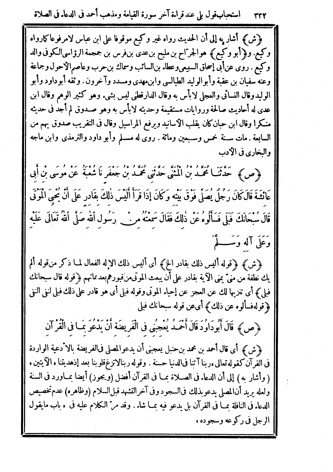 (ص) حَدَّثَنَا مُحَمَّدُ بْنُ الْمُثَنَّى، حَدَّثَني مُحَمَّدُ بْنُ جَعْفَرٍ، نَا شُعْبَةُ، عَنْ مُوسَى بْنِ أَبِي عَائِشَةَ، قَالَ: كَانَ رَجُلٌ يُصَلِّي فَوْقَ بَيْتِهِ، وَكَانَ إِذَا قَرَأَ: {أَلَيْسَ ذَلِكَ بِقَادِرٍ عَلَى أَنْ يُحْيِيَ الْمَوْتَى} [القيامة: 40]، قَالَ: «سُبْحَانَكَ»، فَبَلَى، فَسَأَلُوهُ عَنْ ذَلِكَ، فَقَالَ «سَمِعْتُهُ مِنْ رَسُولِ اللَّهِ صَلَّى اللهُ تَعَالَى عَلَيْهِ وَسَلَّمَ».