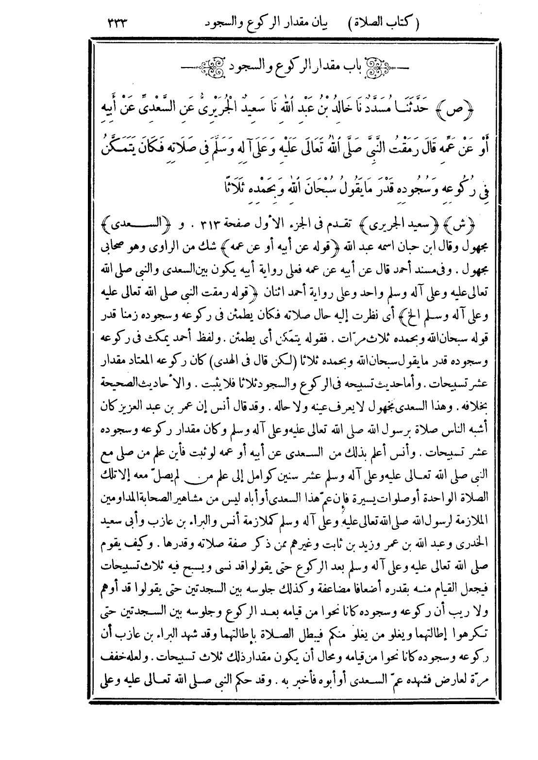 (ص) حَدَّثَنَا مُسَدَّدٌ، نَا خَالِدُ بْنُ عَبْدِ اللَّهِ، نَا سَعِيدٌ الْجُرَيْرِيُّ، عَنِ السَّعْدِيِّ، عَنْ أَبِيهِ، أَوْ عَنْ عَمِّهِ، قَالَ: "رَمَقْتُ النَّبِيَّ صَلَّى اللهُ تَعَالَى عَلَيْهِ وَعَلَى آلِهِ وسَلَّمَ فِي صَلَاتِهِ، فَكَانَ يَتَمَكَّنُ فِي رُكُوعِهِ وَسُجُودِهِ قَدْرَ مَا يَقُولُ: سُبْحَانَ اللَّهِ وَبِحَمْدِهِ ثَلَاثًا"