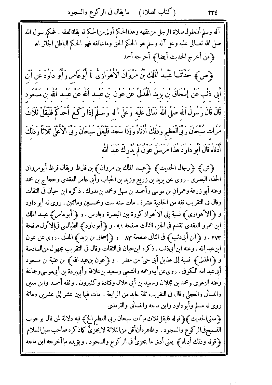 (ص) حَدَّثَنَا عَبْدُ الْمَلِكِ بْنُ مَرْوَانَ الْأَهْوَازِيُّ، نَا أَبُو عَامِرٍ، وَأَبُو دَاوُدَ، عَنِ ابْنِ أَبِي ذِئْبٍ، عَنْ إِسْحَاقَ بْنِ يَزِيدَ الْهُذَلِيِّ، عَنْ عَوْنِ بْنِ عَبْدِ اللَّهِ، عَنْ عَبْدِ اللَّهِ بْنِ مَسْعُودٍ، قَالَ: قَالَ رَسُولُ اللَّهِ صَلَّى اللهُ تَعَالَى عَلَيْهِ وَعَلَى آلِهِ وسَلَّمَ: " إِذَا رَكَعَ أَحَدُكُمْ فَلْيَقُلْ ثَلَاثَ مَرَّاتٍ: سُبْحَانَ رَبِّيَ الْعَظِيمِ، وَذَلِكَ أَدْنَاهُ، وَإِذَا سَجَدَ فَلْيَقُلْ: سُبْحَانَ رَبِّيَ الْأَعْلَى ثَلَاثًا، وَذَلِكَ أَدْنَاهُ "، قَالَ أَبُو دَاوُدَ: «هَذَا مُرْسَلٌ، عَوْنٌ لَمْ يُدْرِكْ عَبْدَ اللَّهِ»