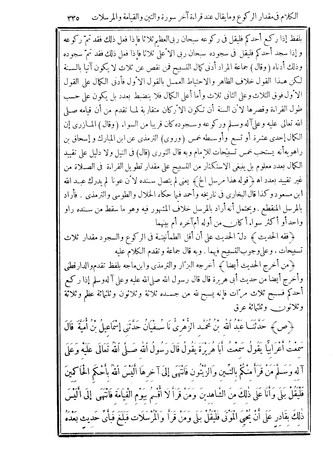 (فقه الحديث) دلّ الحديث على أن أقل الطمأنينة في الركوع والسجود مقدار ثلاث تسبيحات، وعلى وجوب التسبيح فيهما. وبه قال جماعة وتقدم الكلام عليه