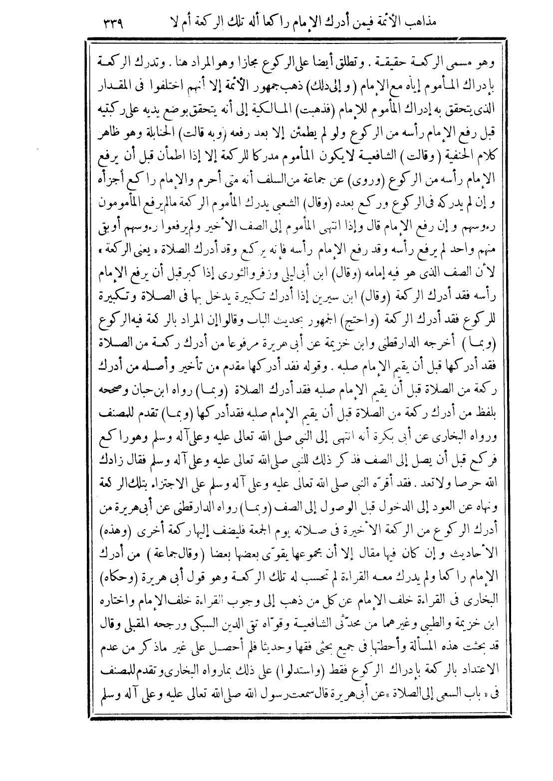 وهو مسمى الركعة حقيقة. وتطلق أيضا على الركوع مجازا وهو المراد هنا. وتدرك الركعة بإدراك المأموم إياه مع الإمام (وكذلك) ذهب جمهور الأممة إلا أنهم اختلفوا في المقدار الذى يتحقق به إدراك المأموم للإمام (فذهبت) المالكية إلى أنه يتحقق بوضع يديه على ركبتيه قبل رفع الإمام رأسه من الركوع ولو لم يطمئن إلا بعد رفعه (وبه قالت) الحنابلة وهو ظاهر كلام الحنفية (وقالت) الشافعية لا يكون المأموم مدركا للركعة إلا إذا اطمأن قبل أن يرفع الإمام رأسه من الركوع (وروى) عن جماعة من السلف أنه متى أحرم والإمام راكع أجزأه وإن لم يدركه في الركوع وركع بعده (وقال) الشعبى يدرك المأموم الركعة ما لم يرفع المأمومون رءوسم وإن رفع الإمام قال وإذا انتهى المأموم إلى الصف الأخير ولم يرفعوا رءوسهم أو بقى منهم واحد لم يرفع رأسه وقد رفع الإمام رأسه فإنه يركع وقد أدرك الصلاة "يعنى الركعة" لأن الصف الذى هو فيه إمامه (وقال) ابن أبى ليلى وزفر والثورى إذا كبر قبل أن يرفع الإمام رأسه فقد أدرك الركعة (وقال) ابن سيرين إذا أدرك تكبيرة يدخل بها في الصلاة وتكبيرة للركوع فقد أدرك الركعة (واحتج) الجمهور بحديث الباب وقالوا إن المراد بالركعة فيه الركوع (وبما) أخرجه الدارقطنى وابن خزيمة عن أبى هريرة مرفوعا من أدرك ركعة من الصلاة فقد أدركها قبل أن يقيم الإمام صلبه وقوله فقد أدركها مقدم من تأخير وأصله من أدرك ركعة من الصلاة قبل أن يقيم الإمام صلبه فقد أدرك الصلاة (وبما) رواه ابن حبان وصححه بلفظ من أدرك ركعة من الصلاة قبل أن يقيم الإمام صلبه فقد أدركها (وبما) تقدم للمصنف ورواه البخارى عن أبى بكرة أنه انتهى إلى النبى صلى الله تعالى عليه وعلى آله وسلم وهو راكع فركع قبل أن يصل إلى الصف فذكر ذلك للنبى صلى الله تعالى عليه وعلى آله وسلم فقال زادك الله حرصا ولا تعد. فقد أقره النبى صلى الله تعالى عليه وعلى آله وسلم على الاجتزاء بتلك الركعة ونهاه عن العود إلى الدخول قبل الوصول إلى الصف (وبما) رواه الدارقطنى عن أبى هريرة من أدرك الركوع من الركعة الأخيرة في صلاته يوم الجمعة فليضف إليها ركعة أخرى (وهذه) الأحاديث وإن كان فيها مقال إلا أن مجموعها يقوى بعضها بعضا (وقال جماعة) من أدرك الإمام راكعا ولم يدرك معه القراءة لم تحسب له تلك الركعة وهو قول أبى هريرة (وحكاه) البخارى في القراءة خلف الإمام عن كل من ذهب إلى وجوب القراءة خلف الإمام واختاره ابن خزيمة والطيبي وغيرهما من محدّثى الشافعية وقواه تقى الدين السبكي ورجحه المقبلى وقال قد بحثت هذه المسألة وأحطتها في جميع بحثى فقها وحديثا فلم أحصل على غير ما ذكر من عدم الاعتداد بالركعة بإدراك الركوع فقط (واستدلوا) على ذلك بما رواه البخارى وتقدم للمصنف في "باب السعى إلى الصلاة" عن أبى هريرة قال سمعت رسول الله صلى الله تعالى عليه وعلى آله وسلم